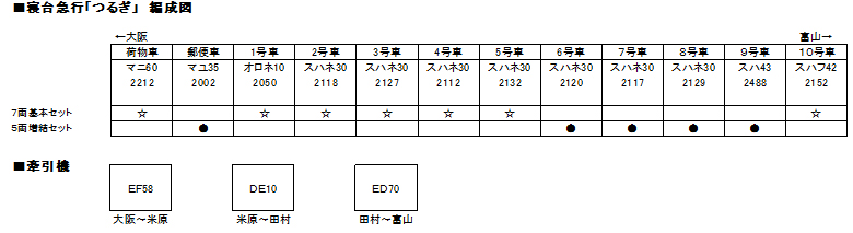 ・車体色はマニ60とマユ35がぶどう色2号、等級帯はなしの青15号。等級表記はオロネ10が「A寝台」、スハネ30が「B寝台」。各種サボは印刷済みで行先は「富山行」。編成端のマニ60、スハフ42のテール点灯側には検査表記を印刷。