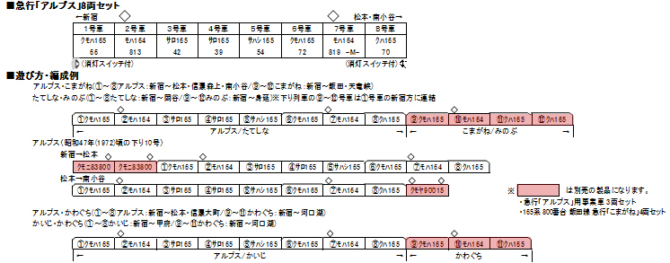 ◆先行して発売の〈165系急行「こまがね」〉との併結により新宿口で見られた12両編成が完成します。また同時発売される〈急行「アルプス」用 事業用車セット〉と併せることで新宿〜松本間の荷物電車との併結や、先頭にクモヤ90を連結した大糸線の初電を兼ねた運転を再現することができます。