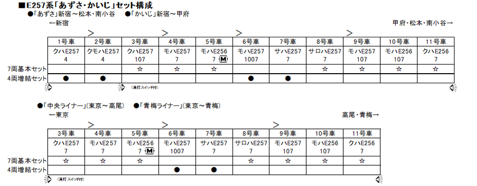 ●ヘッドマーク・行先表示シールに「あずさ」「かいじ」の他に「中央ライナー」「青梅ライナー」を収録。