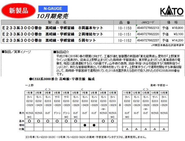 ?上野東京ライン用、211系置換用に増備されたE233系3000番台。高崎車両センター所属のL13+D13編成をプロトタイプに製品化。