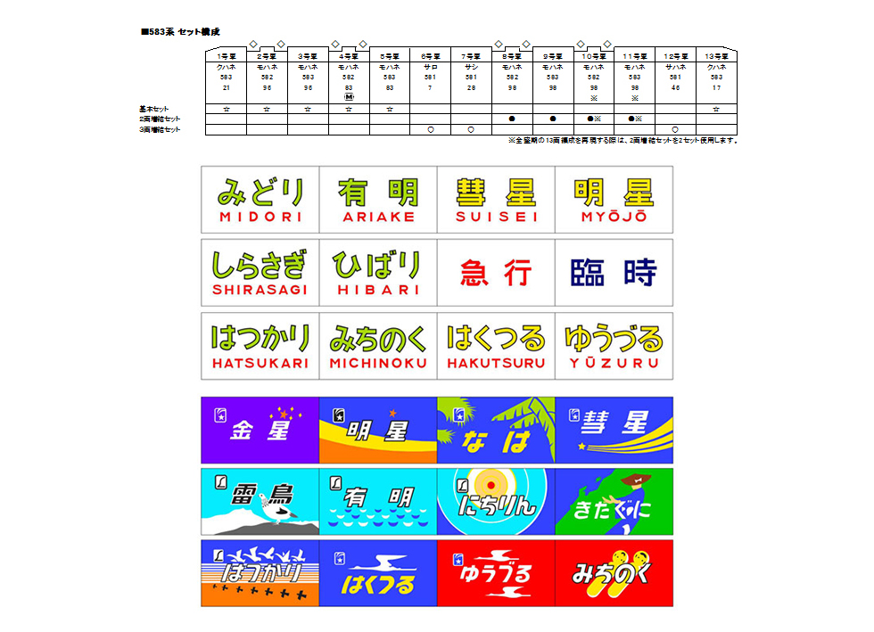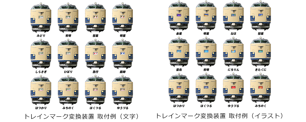 ● 先頭車前面にはトレインマーク変換装置を装備。「はつかり」「はくつる」「明星」「雷鳥」(イラストタイプ)を選定。別売で、583系・581系に対応する● トレインマーク変換装置のセット(文字とイラストの2種)を同時に発売。
