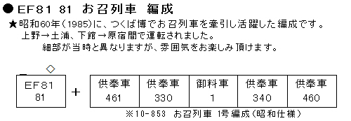 EF81 81は、昭和60年(1985)「国際技術博覧会」(通称:つくば万博)の際に、お召列車牽引機として車体側面の銀帯や各所の銀塗装などが施行されました。2度のお召列車1号編成牽引の他、「オリエントエクスプレス’88」や「北斗星」を牽引し活躍しました。