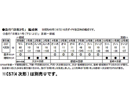 京都発で山陽路を通り、九州島内は日豊本線で大分・宮崎と南下し、都城までの1000km近くを結んでいた急行列車です。京都出発時は13両編成の堂々たる編成ですが、途中大分で寝台車3両を切り離し10両編成に。さらに宮崎で座席車を3両切り離して7両編成となり、DF50から引き継いだC57が最終行路の都城までの50kmを力走し、SLブームのさ中、多くのファンを日向路に引き寄せました。(上り列車の「日南1号」はDF50牽引。)