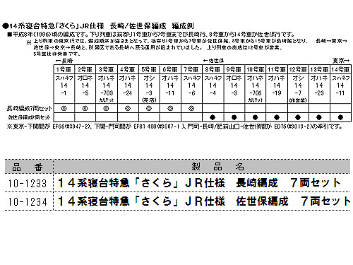 ・カルテット(4人個室)のオハネ14 700番台を含む7両編成を、長崎編成、佐世保編成で、車番と側面行先表示を作り分けて製品化。