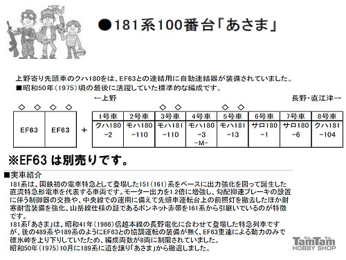 181系「あさま」は、昭和41年(1966)信越本線の長野電化に合わせて登場した特急列車ですが、後の489系や189系のようにEF63との協調運転の装備が無く、EF63重連による動力のみで碓氷峠を上り下りしていたため、編成両数が8両に制限されていました。