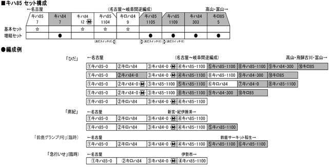 ◆現行の編成が再現できるよう、全室グリーン先頭車のキロ85、キロ85を含む編成には欠かせないキハ84 300番台、バリアフリー対応の改造車キハ85 1100番台もラインナップ。