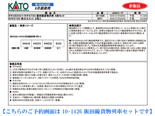 飯田線のシリーズ展開として、新発売のED62の牽引用として、セメント貨車とタンク車の小貨物列車をリリースいたします。武骨な外観を持つセメント輸送専用のホキ5700と、長い全長で非常にスマートなLPガス輸送専用のタキ25000に車掌車のヨ5000で構成します。