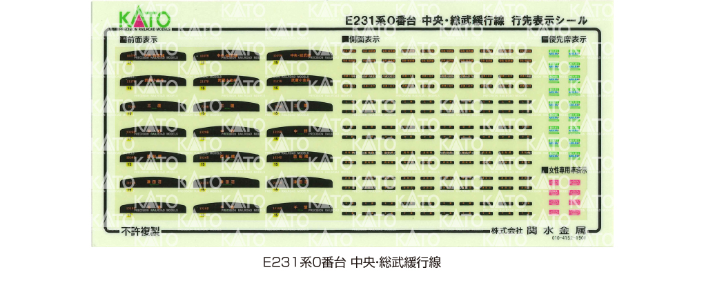 ?基本セットに行先表示シール付属。行先表示、前面編成番号札のほか、女性専用車表示、優先席表示を収録。