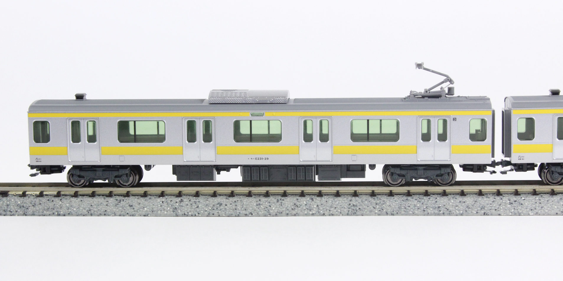 ?E231系0番台初期車の特徴である、側面スピーカー準備蓋がなく、幕板の帯が繋がる車体を再現。