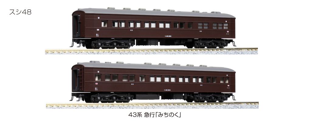 ?スシ48は原形の丸屋根で、ウィンドシル・ヘッダーリベットありの姿を再現。特徴的な3軸台車を再現。