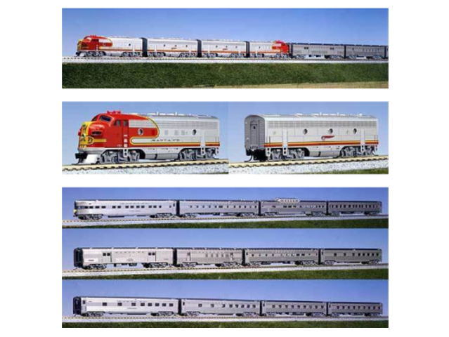 全個室寝台特急「スーパーチーフ」号は、1937年シカゴ〜ロサンゼルス間で運行を開始。実車は1954年に短編成化されましたが、模型では1953年夏期の週末編成(12両編成)を忠実に再現。 別売のF7機関車との組み合わせでスーパーチーフ黄金期の姿を楽しめます。