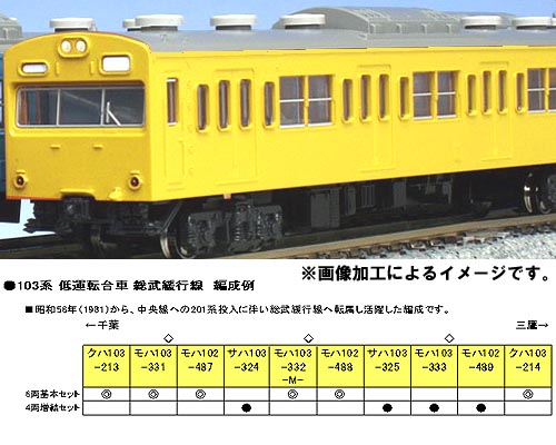 行線(カナリア色)で活躍した、先頭車クハ103の低運転台車を、2線区2色の色違いで製品化いたします。
