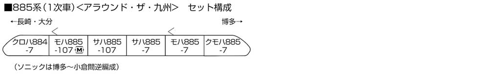 JR九州の885系は、883系をベースに開発した振子機構搭載の交流特急形電車です。平成12年(2000)に、従来の485系を置き換えて速度向上を図るべく「かもめ」の運用で長崎本線で活躍をはじめ、翌平成13年(2001)には「ソニック」用として増備されて運用線区を日豊本線へと拡げました。平成22年(2010)からは、「白いかもめ」として登場した1次車も増備の2次車に合わせて当初の黄色帯から青色帯に塗り替えて車体各所のロゴマークも「かもめ」から「AROUND THE KYUSHU」へと変更され、「かもめ」「ソニック」として活躍しています。