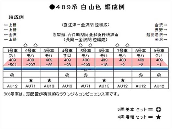 6号車のモハ489は、半室がラウンジとコンビニエンスカーに改造され、窓配置がわずかに変更となっています。