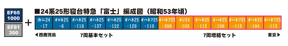 元祖「ブルートレイン」20系を引き継いで、昭和50年代、空前の「ブルトレブーム」を巻き起こした、主役の列車たち「ニューブルートレイン」が帰ってきます。2段寝台車の24系25形客車に、新たに個室のA寝台車オロネ25を加えて、東海道本線の寝台特急群に投入され、当時日本最長の走行距離(東京-西鹿児島間15742Km)を24時間余りをかけて結んだ寝台特急「富士」は、当時の少年たちの憧れの的でした。