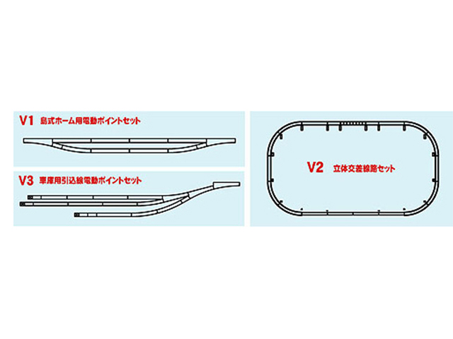 新幹線が走行可能な曲線R315を採用したパワーパック付きのエンドレス基本セットの「マスター1」 「マスター2」 に追加して、レイアウトプランを簡単に実現できるNユニトラックの新シリーズ「V線路セットシリーズ」プランバリエーションセット