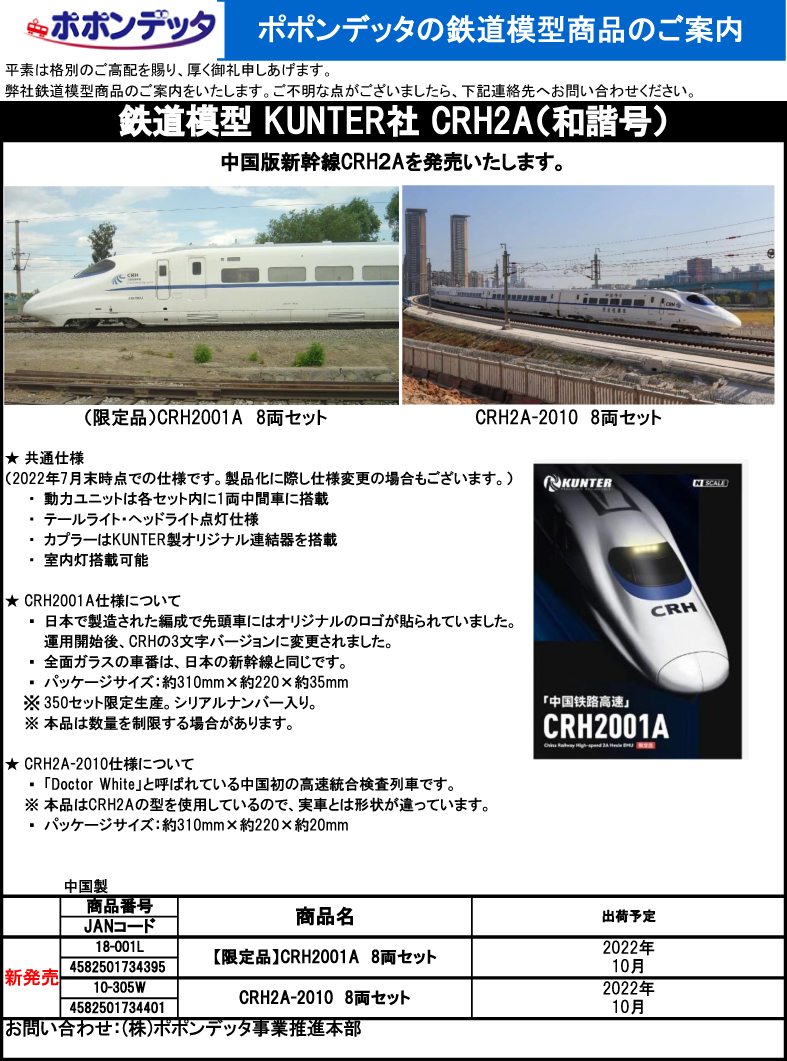 KUNTER製CRH2A和諧号 中国版新幹線をポポンデッタが輸入し発売いたします。