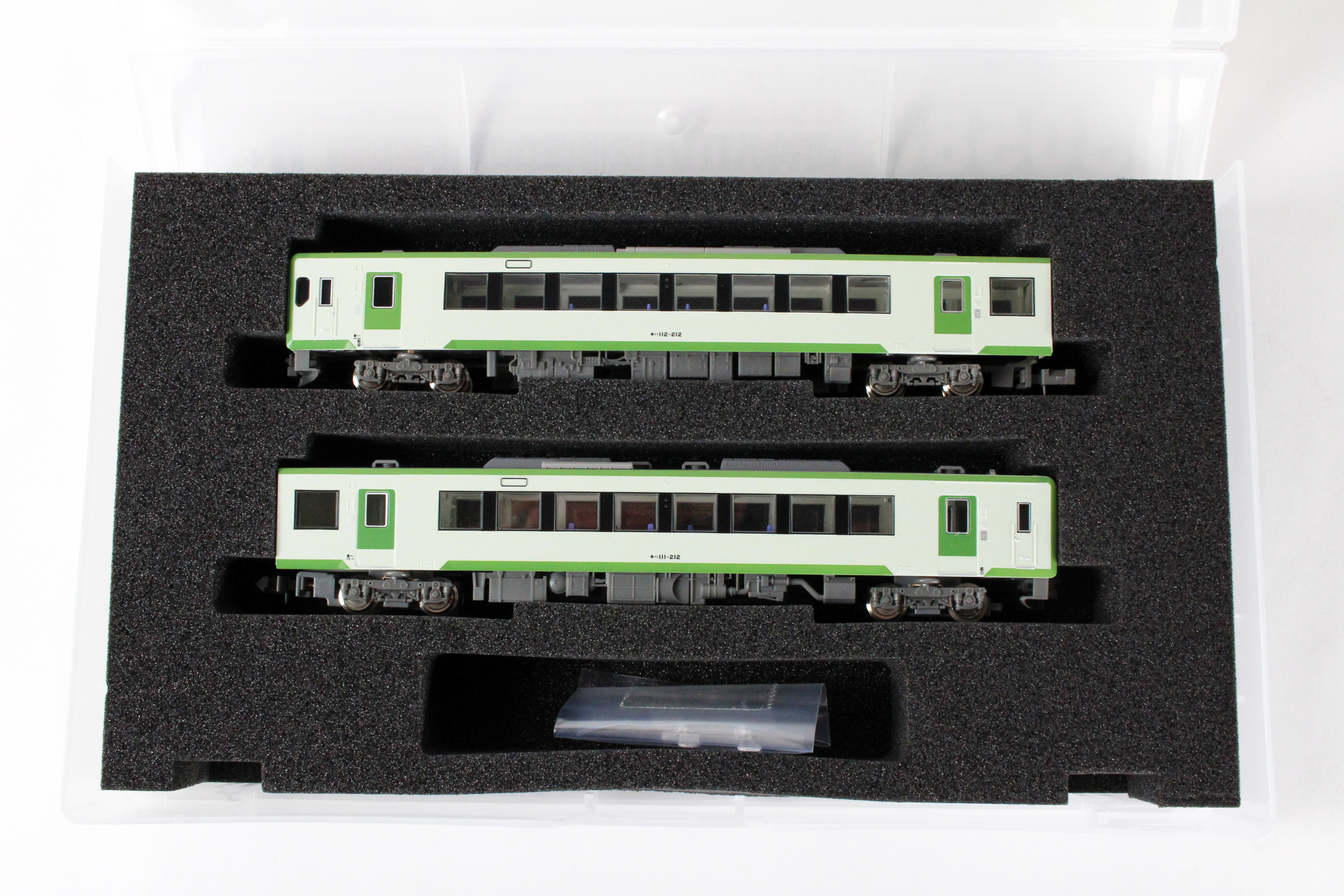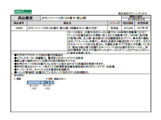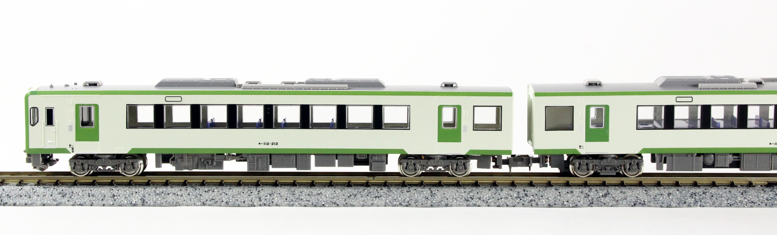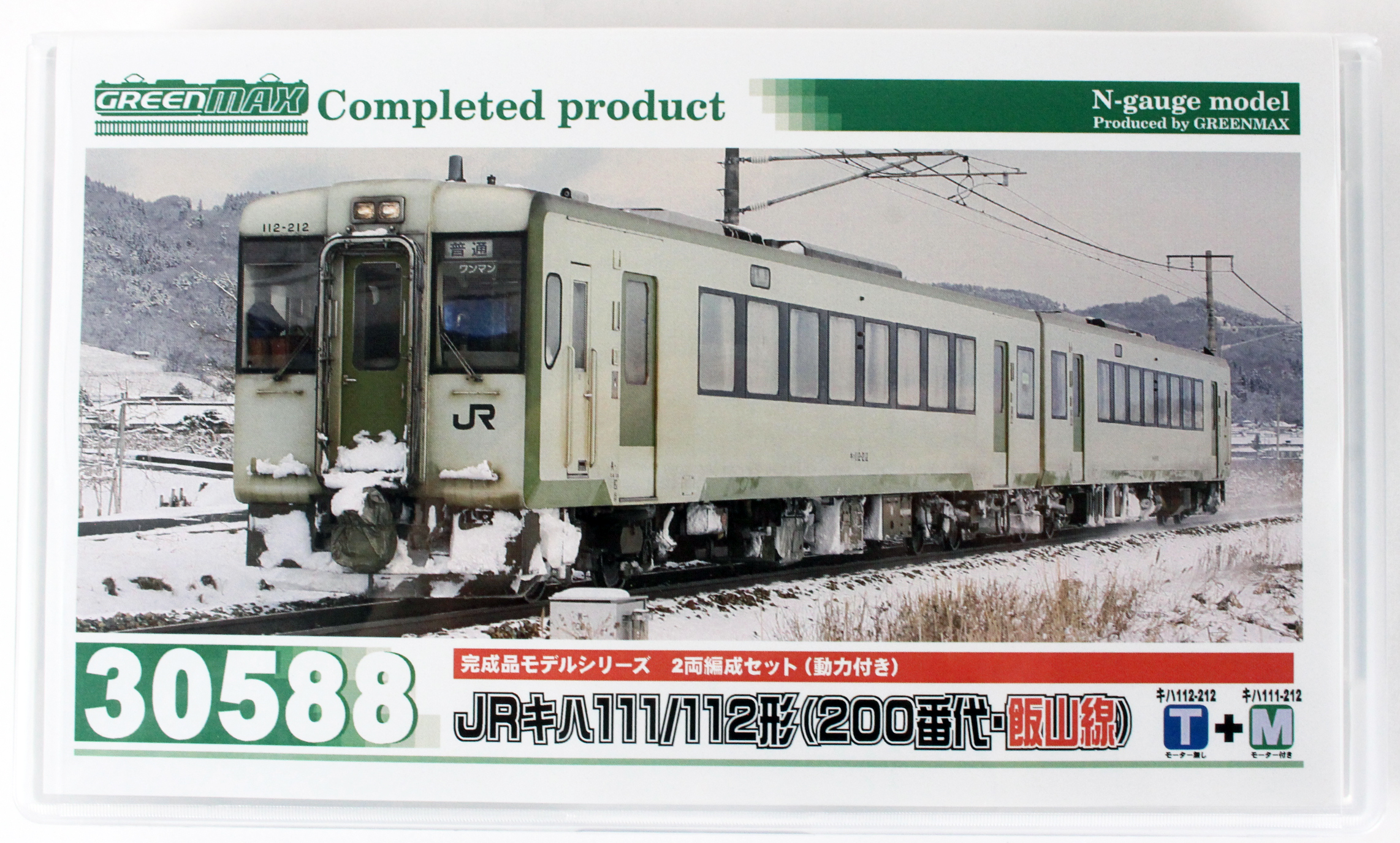 キハ110系は、JR東日本のローカル線でキハ58系等の気動車にかえてサービス改善を図るため開発・投入された気動車です。1990年に試作車が登場以降、北上線・釜石線はじめ活躍範囲を広げつつ、車体長や運転台のバリエーションを増やし、現在も各線区の輸送を担っています。そのうちのキハ111/112形は全長20m、片運転台車でペアを組んで活躍しています。製品は飯山線で活躍するキハ111/112形200番代をモチーフとし、同系の標準色であるやや緑がかった白ベースにグリーンのアクセントが入った配色を再現します。