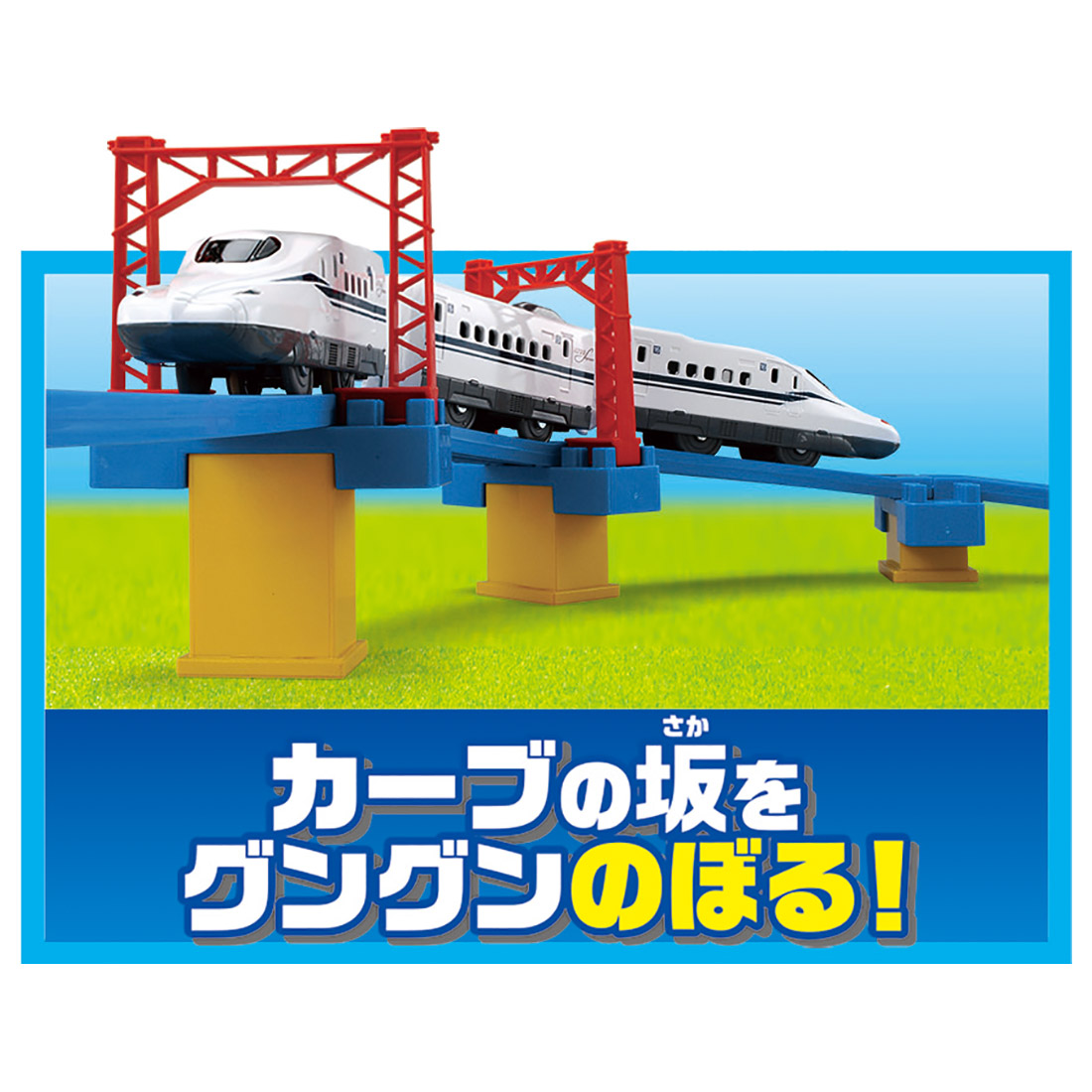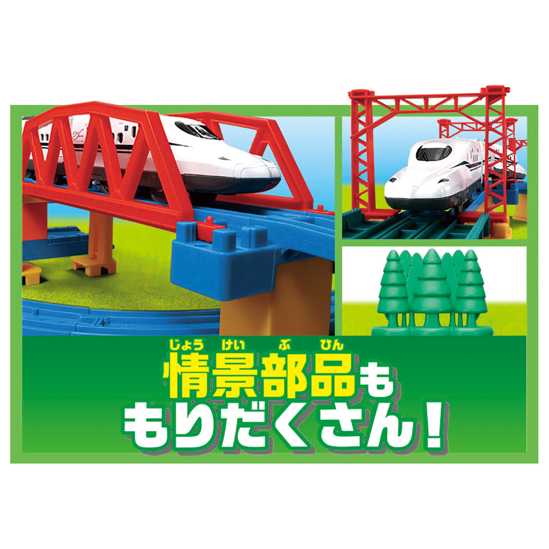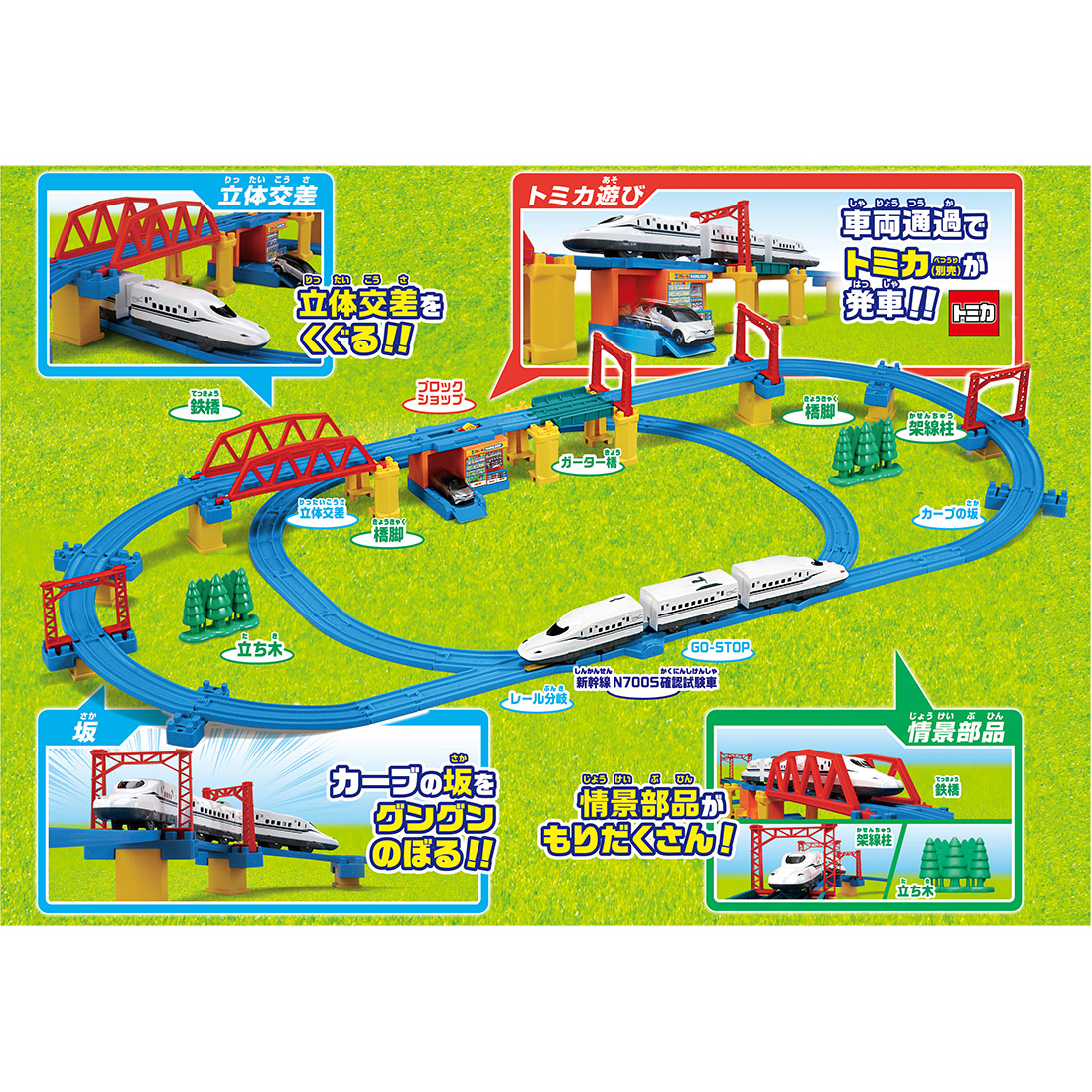 商品内容直線レール(2)、1/2直線レール(5)、ガーター橋(1)、1/4直線レール(凸凸)(1)、1/4直線レール(凹凹)(1)、1/4直線レール(凸凹)(2)、曲線レール(6)、1/2ストップレール(1)、ターンアウトレール(L)(1)、ターンアウトレール(R)(1)、坂曲線レール(A)(4)、坂曲線レール(B)(4)、坂曲線レール用橋脚L(2)、坂曲線レール用橋脚M(2)、坂曲線レール用橋脚S(2)、ブロック橋脚(3)、鉄橋枠(2)、単線架線柱(4)、立ち木(半立体)(2)、ブロックショップ(1)、ブロックショップ用レール(1)、新幹線 N700S確認試験車3両編成(1)、シール(1)、レイアウトブック(1)、部品注文書(1