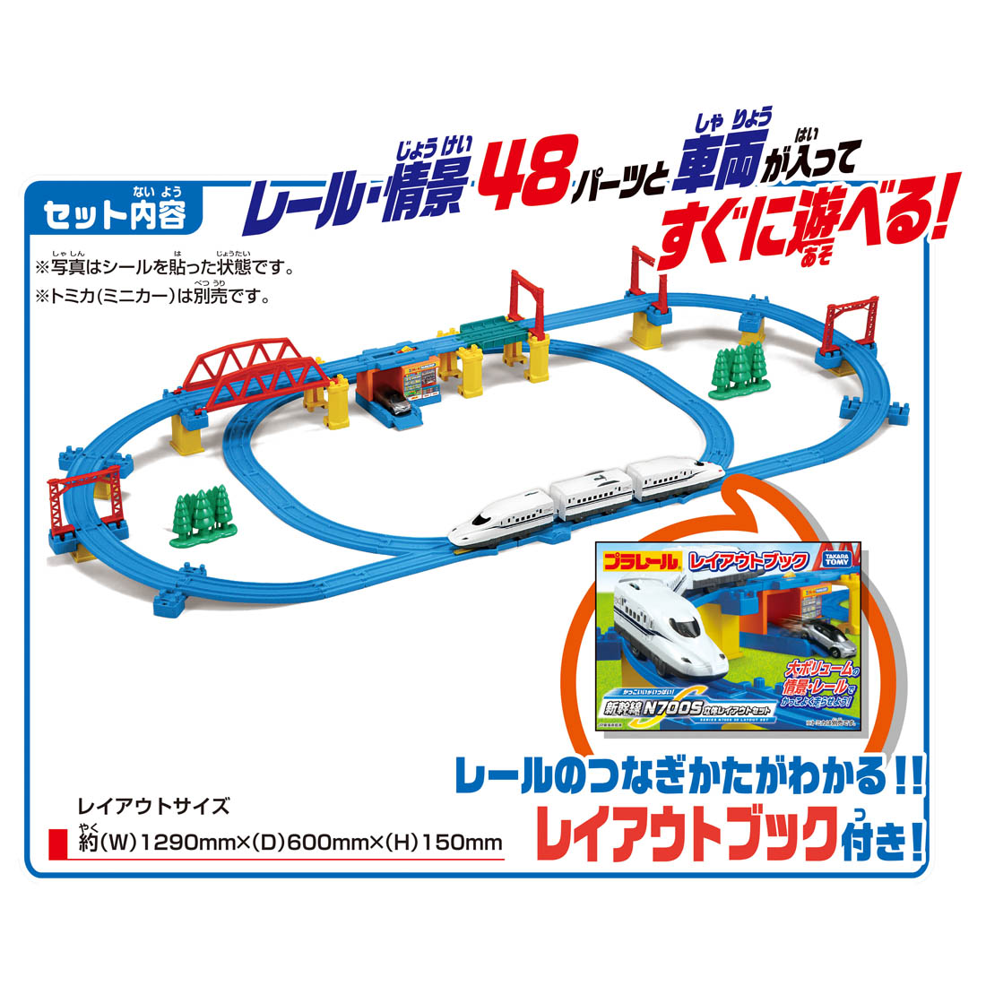 商品内容直線レール(2)、1/2直線レール(5)、ガーター橋(1)、1/4直線レール(凸凸)(1)、1/4直線レール(凹凹)(1)、1/4直線レール(凸凹)(2)、曲線レール(6)、1/2ストップレール(1)、ターンアウトレール(L)(1)、ターンアウトレール(R)(1)、坂曲線レール(A)(4)、坂曲線レール(B)(4)、坂曲線レール用橋脚L(2)、坂曲線レール用橋脚M(2)、坂曲線レール用橋脚S(2)、ブロック橋脚(3)、鉄橋枠(2)、単線架線柱(4)、立ち木(半立体)(2)、ブロックショップ(1)、ブロックショップ用レール(1)、新幹線 N700S3両編成(1)、シール(1)、レイアウトブック(1)、部品注文書(1)