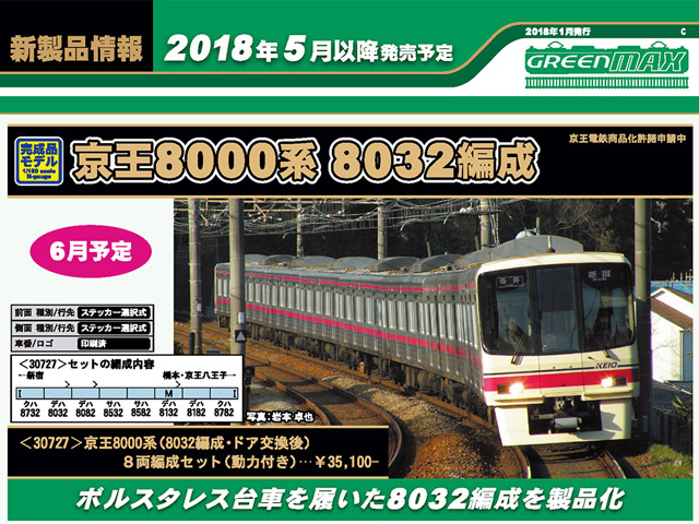 京王8000系は、京王の車両の中では初のVVVFインバータ制御を採用した車両で、1992年から1999年にかけて10両編成(6両+4両)14本・8両編成13本が製造されました。6000系の後継車として特急や準特急を中心に使用され、現在も京王を代表する主力車両となっています。2005年までにパンタグラフがシングルアーム化され2008年頃までには方向幕がフルカラーLED化されています。8032編成と8033編成は他の編成と異なるボルスタレス台車を装備しており、製品は客扉が大規模改修車と同様の窓がやや小ぶりなものに交換された8032編成をプロトタイプとしています。