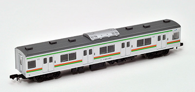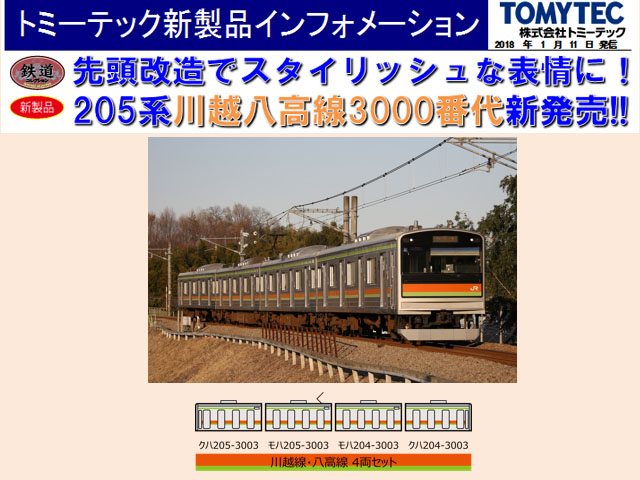 JR205系3000番代は5編成が川越線・八高線に投入されました。全て山手線から転用された車両でドアの窓は小型です。製品のプロトタイプであるハエ83編成は土崎工場(現:秋田総合車両センター)で先頭改造が施されました。総武線などで活躍するE231系が川越線へ転用されることが決まり、置き換えが予定される205系3000番代は最後の活躍を見せています。製品は2017年現在の姿を再現します。