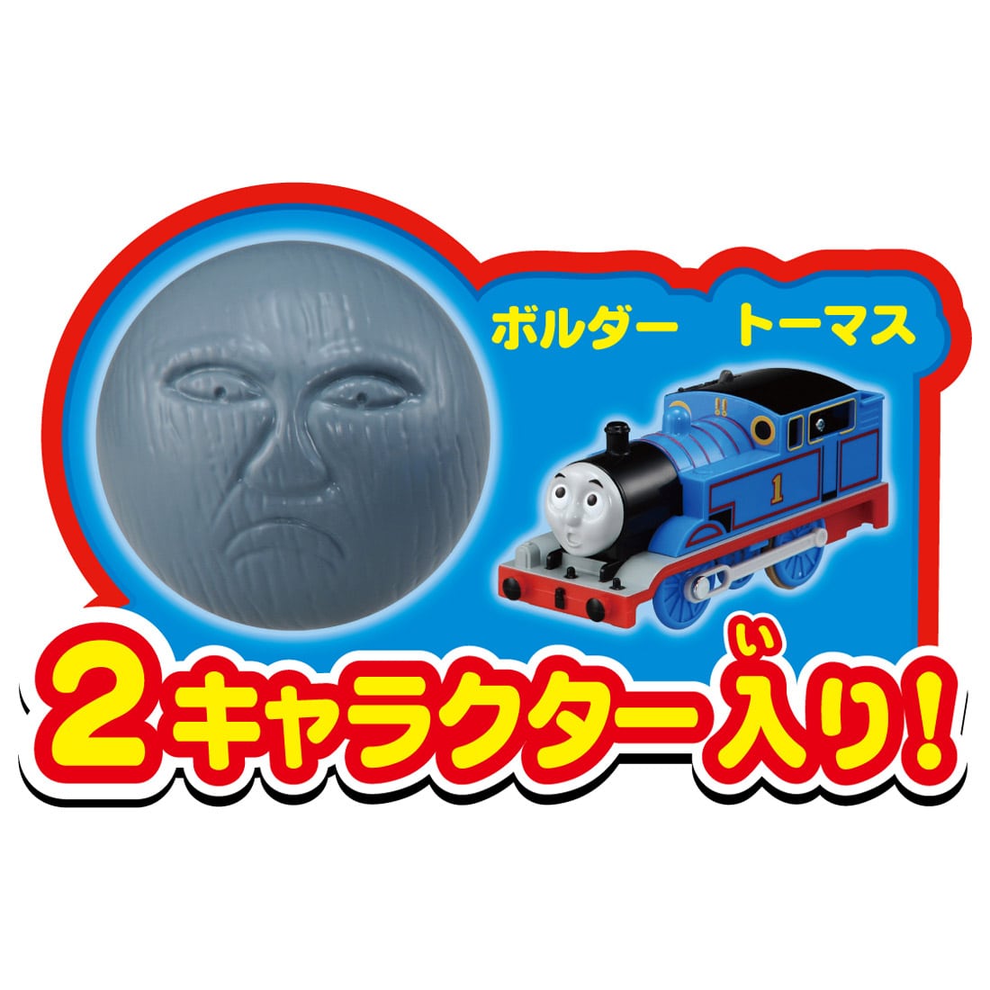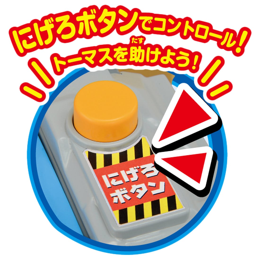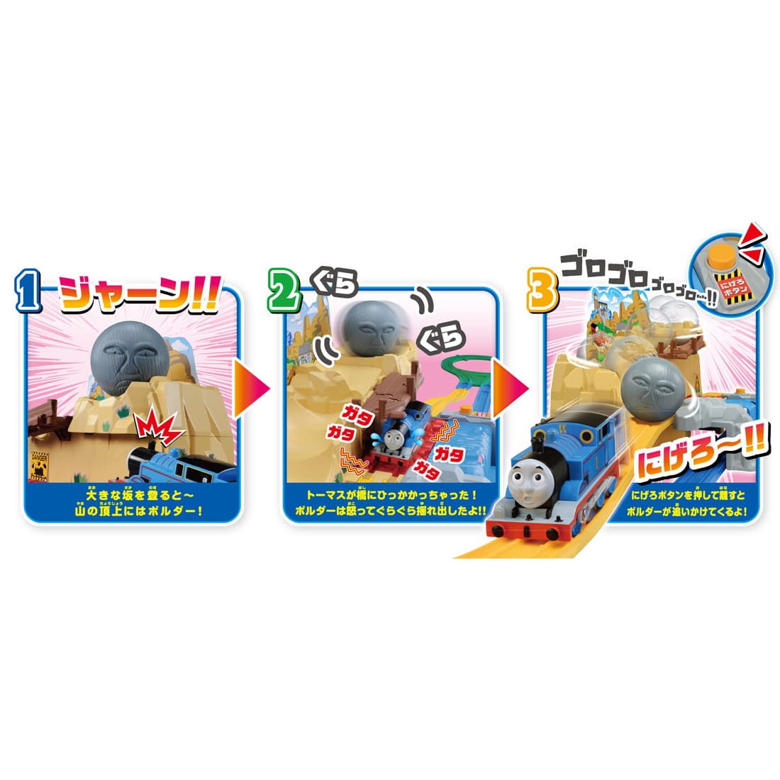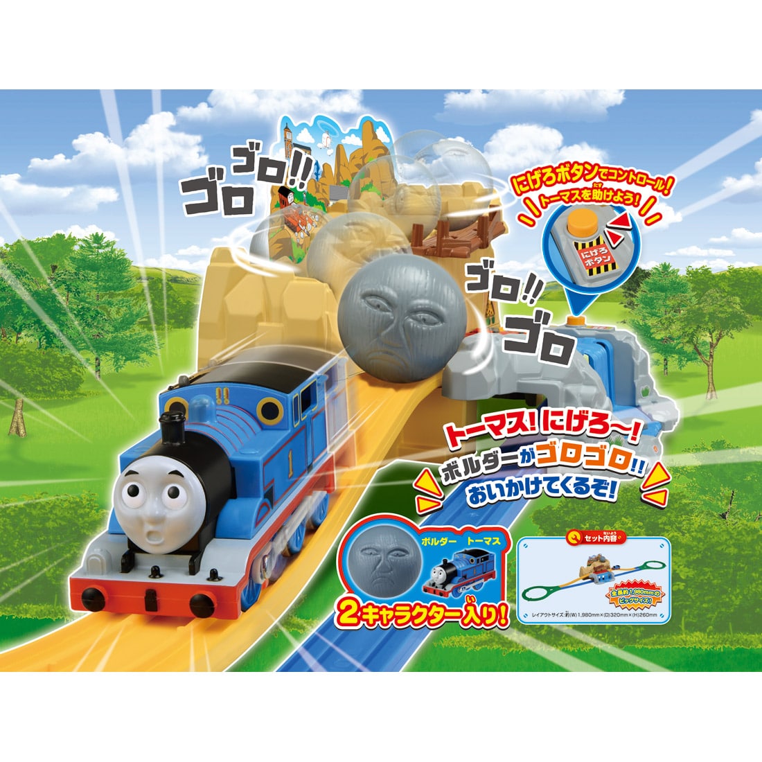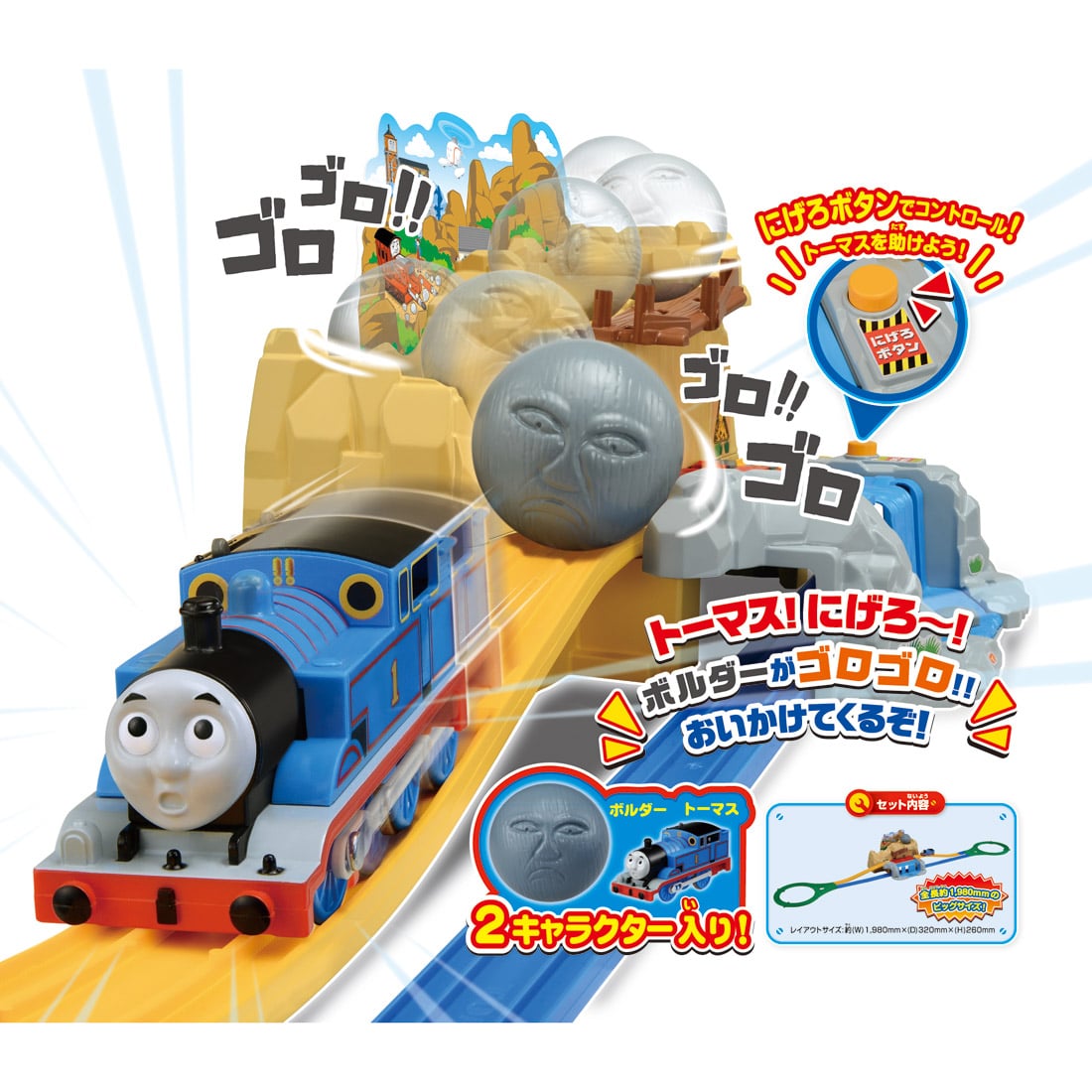 「にげろボタン」を押すとぐらぐら橋にひっかかったトーマスが出発し、「にげろボタン」を指から離すとボルダーが岩山からゴロゴロと転がってトーマスを追いかけてきます。ボタン操作でトーマスをうまく助けてあげよう!レール、動力車1両付き。