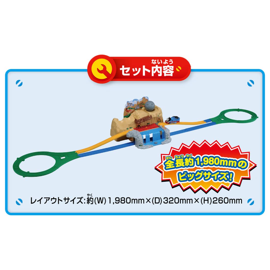 商品内容岩山本体(1)、滝トンネルパーツ(1)、木の道パーツ(1)、ボルダー(1)、トーマス(動力車)(1)、直線レール(5)、1/4直線レール(凸凸)(2)、Uターンレール一式(2)、坂レール(2)、背景パネル(1)、シール(1)、部品注文書(1)