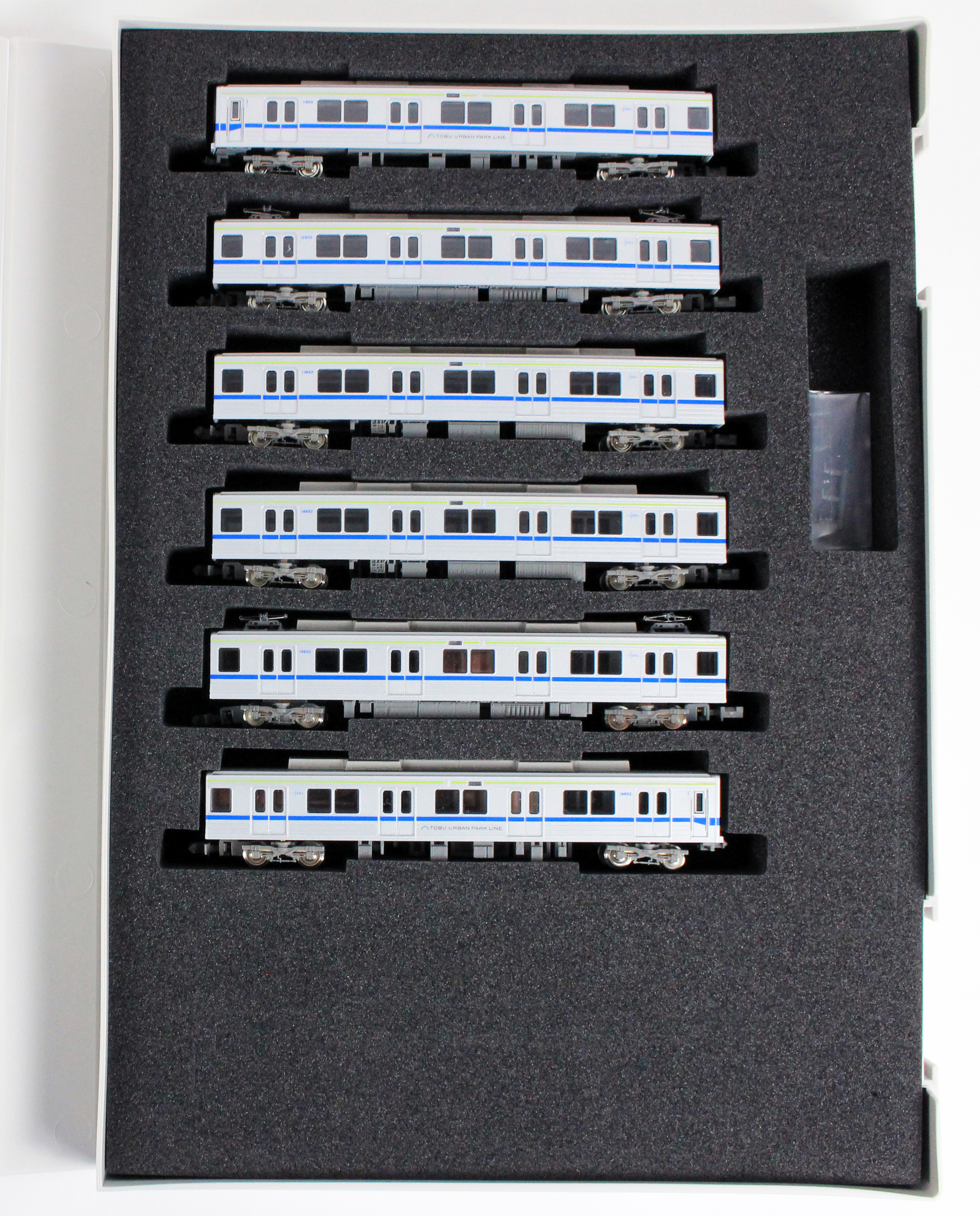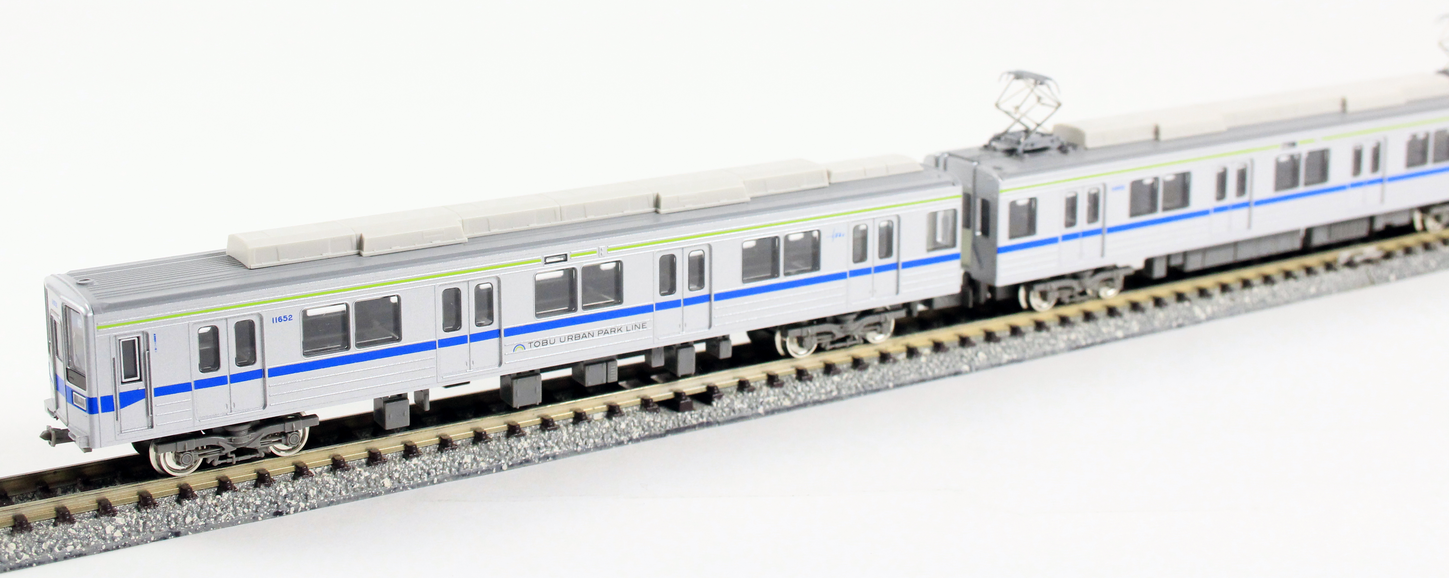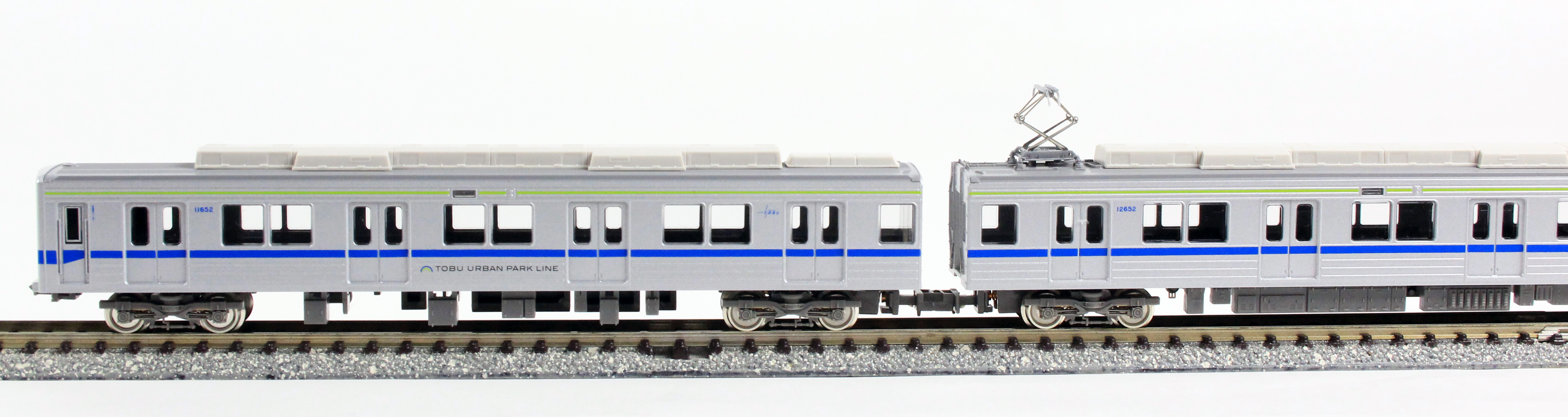 東武10030型10050番代車は、10030型をベースに1992年以降製造されたグループで、屋上通風器の廃止と連続した冷房装置カバーが外観上の特徴です。2両・4両・6両の固定編成があり、他系列の車両との併結運用も見られます。このうち6両固定編成車で東武アーバンパークラインに転属した編成は、帯色が青色(フューチャーブルー)と黄緑(ブライトグリーン)に変更され、「TOBU URBAN PARK LINE」のロゴが前面と先頭車側面に貼付され大きくイメージが変わりました。また、同線は併結運用がないため、貫通幌の取付金具や前面の渡り板が撤去され、現在は正面にホーム検知装置が設置されています。