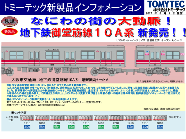 10系は大阪市交通局で唯一のチョッパ制御車で、試作車は20系(初代)として1973年に谷町線でデビューしました。翌年には御堂筋線に転属され10系へと改番されました。誘導障害や冷房装置などの試験を経て1976年より営業運転を開始。量産車は1979年から1989年にかけて合計234両が製造されました。1995年には輸送力増強のため編成を組み替え、10両編成となりました。2006年からは更新工事が施され車齢の若い17編成以降の車両は制御機器をVVVFインバータに載せ替える工事も合わせて行われました。