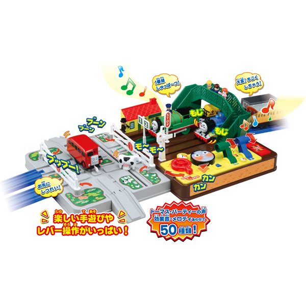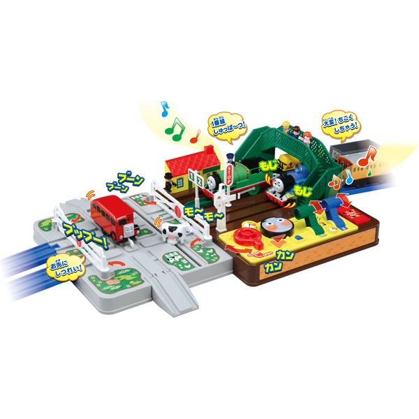 踏切を開いて、付属のテコロでサウンドバーティや牛を手でわたらせて遊べます。