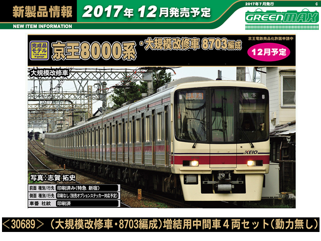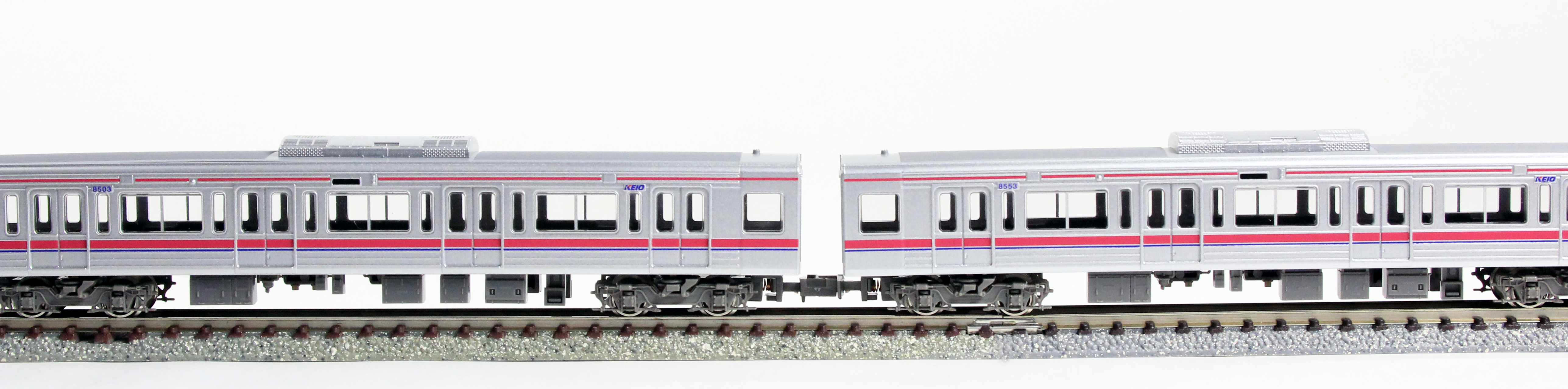京王8000系は、京王の車両の中では初のVVVFインバータ制御を採用した車両で、1992年から1999年にかけて10両編成14本・8両編成13本が製造されました。6000系の後継車として特急や準特急を中心に使用され、現在でも京王の主力車両となっています。先頭車のデザインは、丸みを帯びた半流線型となり、5000系のイメージを踏襲しています。登場当初は、方向幕部は0番台が幕式・20番台はLED式が採用されていましたが、2008年に改造工事が行われ、全車両がフルカラーLEDとなりました。また、当初は菱形パンタグラフでしたが、現在では全ての編成がシングルアーム式に換装されています。2014年からは、10両編成の中間運転室を撤去し、クハからサハへと車番変更、ドアの交換、貫通扉交換、車内内装の変更等を行う、大規模改修が行なわれています。製品は、大規模改修が行われ、種別・行先方向幕がフルカラーLED化、中間の先頭車から運転室を撤去し、車両番号が変更された姿を再現しています。