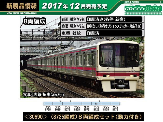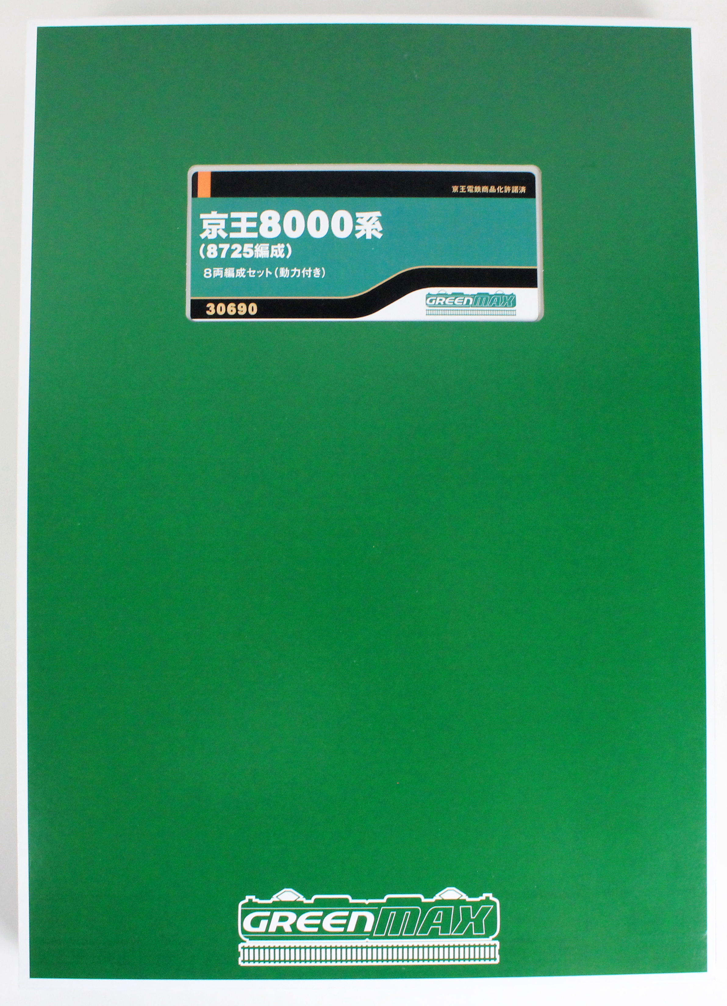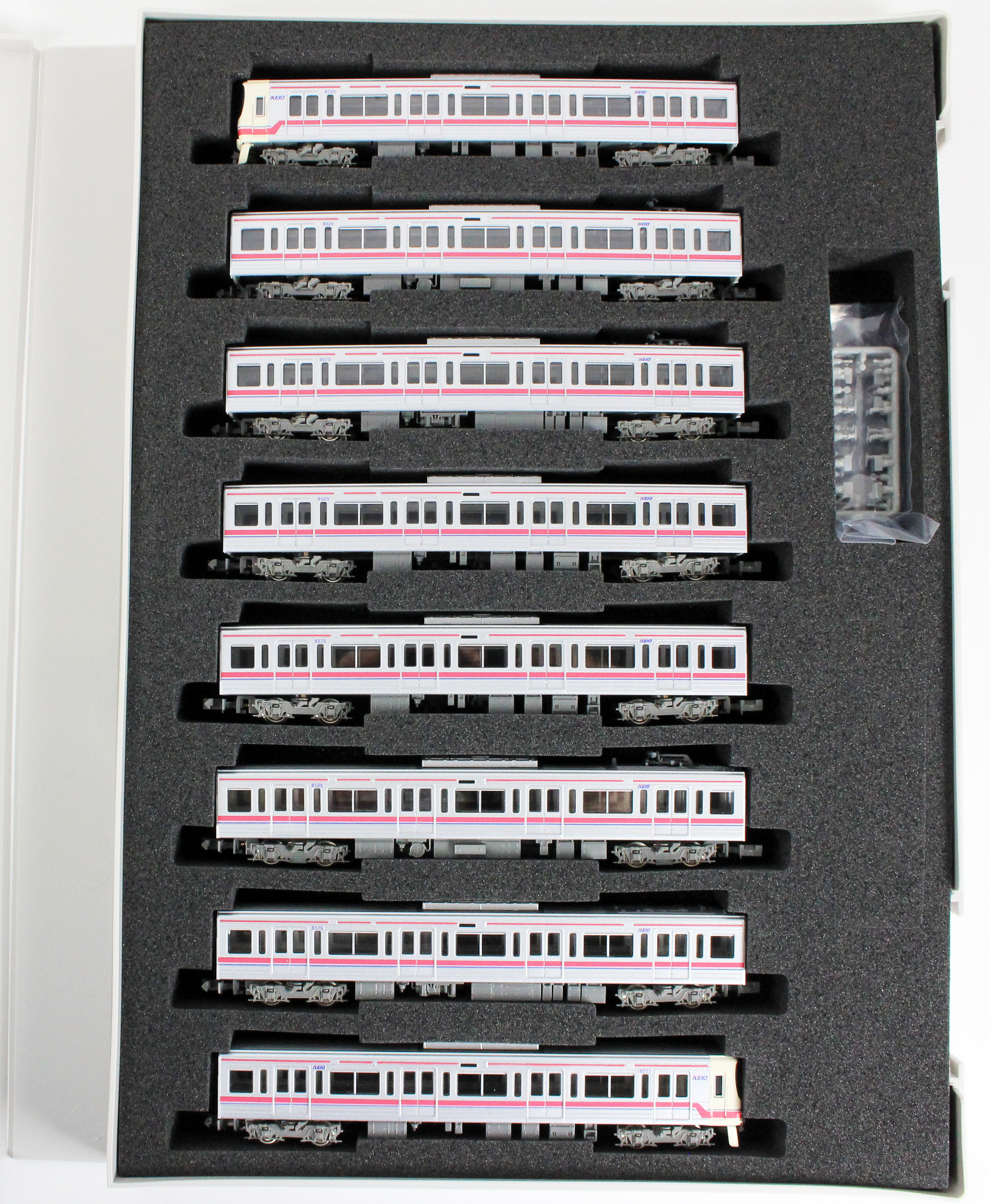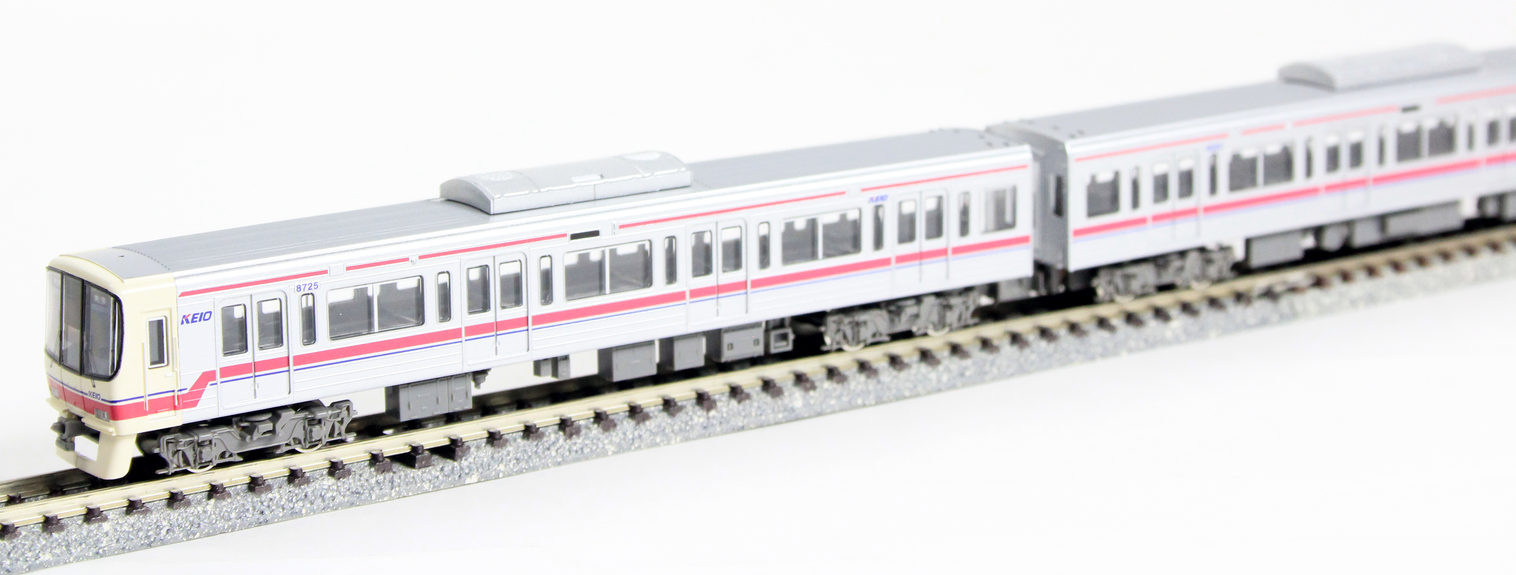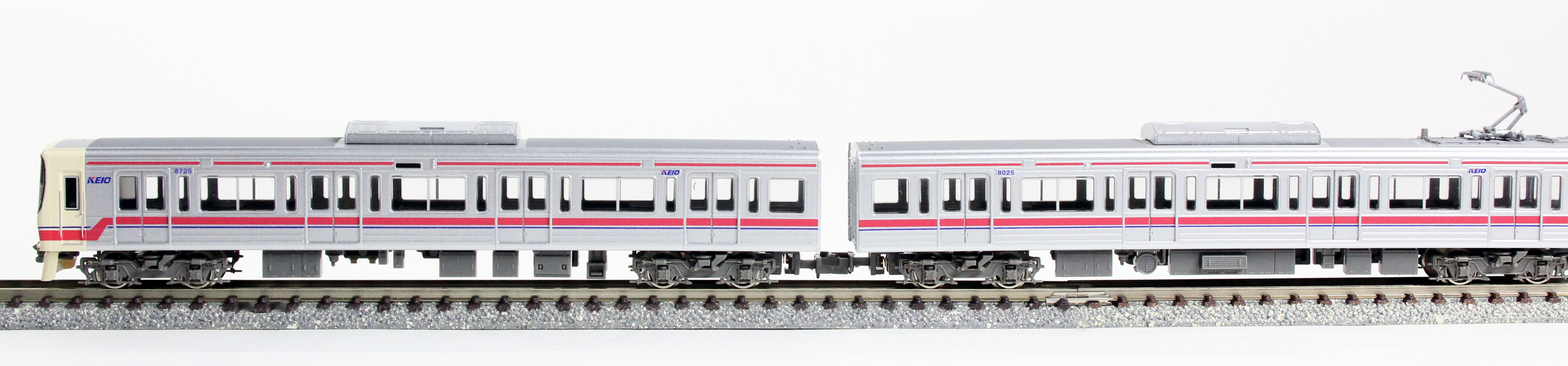 京王8000系は、京王の車両の中では初のVVVFインバータ制御が採用された車両で、1992年から1999年にかけて10両編成14本・8両編成13本が製造されました。6000系の後継車として特急や準特急を中心に使用され、現在でも京王の主力車両となっています。先頭車のデザインは、丸みを帯びた半流線型となり、5000系のイメージを踏襲しており、登場当初は、方向幕部は0番台が幕式・20番台がLED式を採用していましたが、2008年に改造工事が行われ、全車両がフルカラーLEDとなりました。また、当初は菱形パンタグラフでしたが、現在では全ての編成がシングルアーム式に換装されています。1995年より製造された8両編成は、8725編成までが前面種別表示が幕式、側面行先表示はLED式、それ以降の編成は前面、側面共にLED式での製造となっています。その後全編成がLED化された後、フルカラーLED化されています。製品は、大規模改修前の、種別・行先方向幕がフルカラーLED化した姿を再現しています。