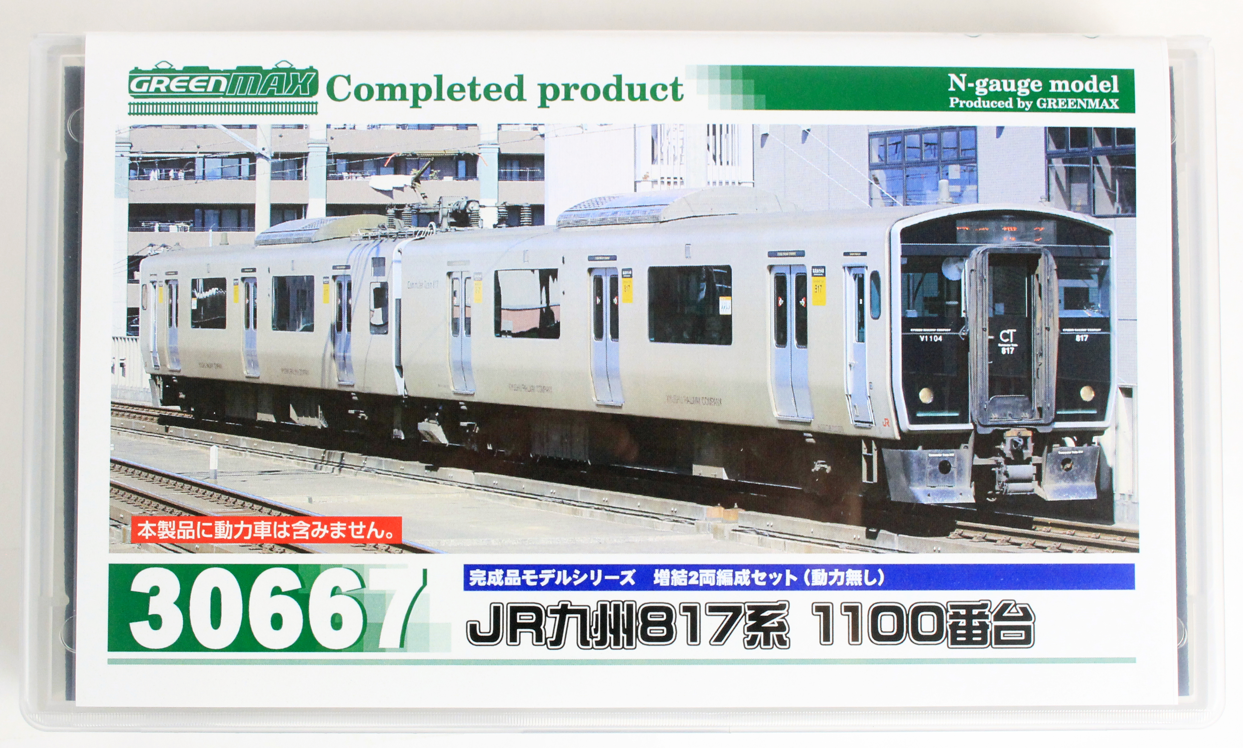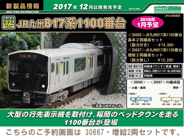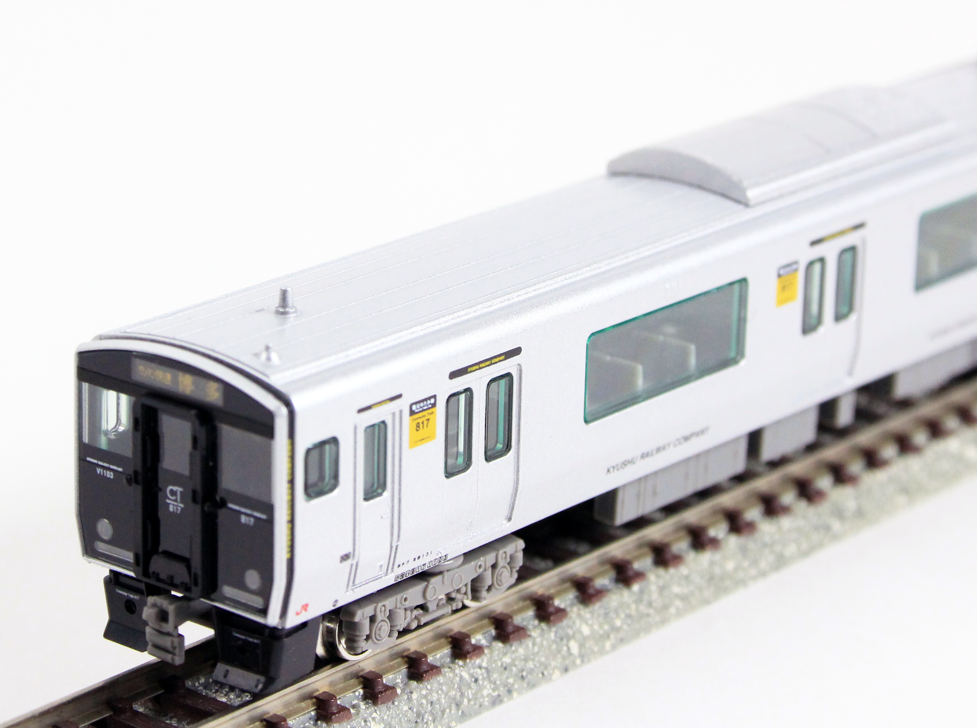 JR九州817系は、2001年に北九州地区に導入された20m3扉の近郊型車両で、その後使用線区にあわせたバリエーション展開により九州全域で活躍しています。0番台・1000番台・1100番台はアルミヘアライン仕様の転換クロスシート車、2000番台・3000番台はアルミ車体に白色塗装を施したロングシート車です。2〜3両で1ユニットとして編成され、他形式(813・815系等)との併結や数ユニットの併結による長編成での運用も可能な車両で、各地域都市圏の混雑緩和に貢献しています。今回製品化をする1100番台は、篠栗線(福北ゆたか線)の混雑緩和を目的として、2007年に登場致しました。1000番台に比べて、前面・側面の行先表示機が拡大され、クモハの妻面の貫通扉が設置されているのが大きな特徴です。2017年7月現在で4編成が篠栗線(福北ゆたか線)を中心に活躍しています。