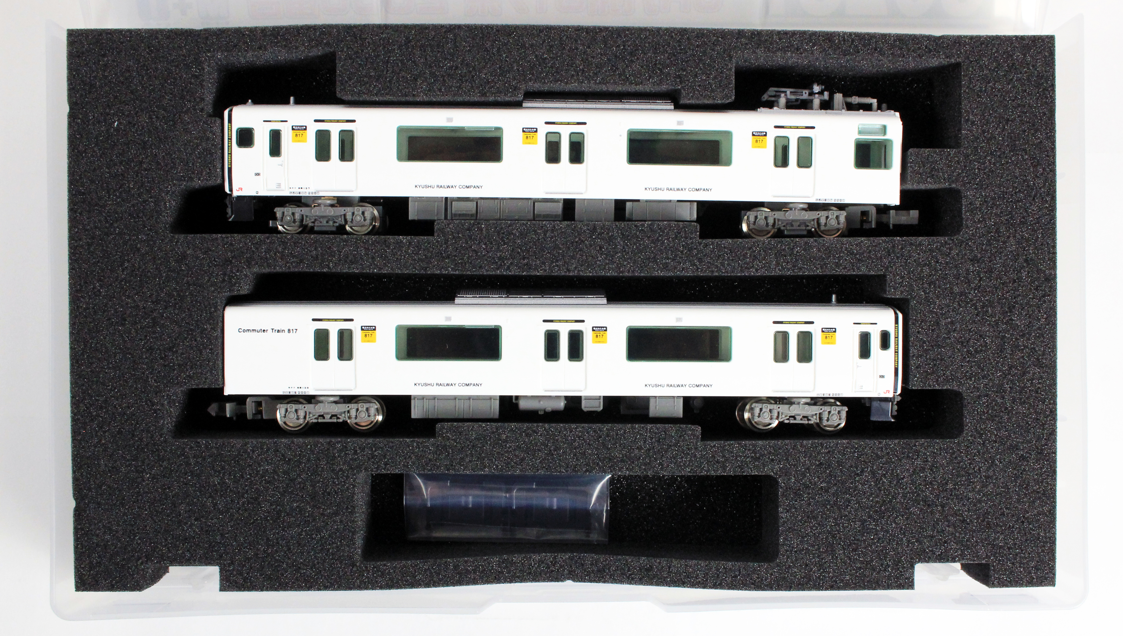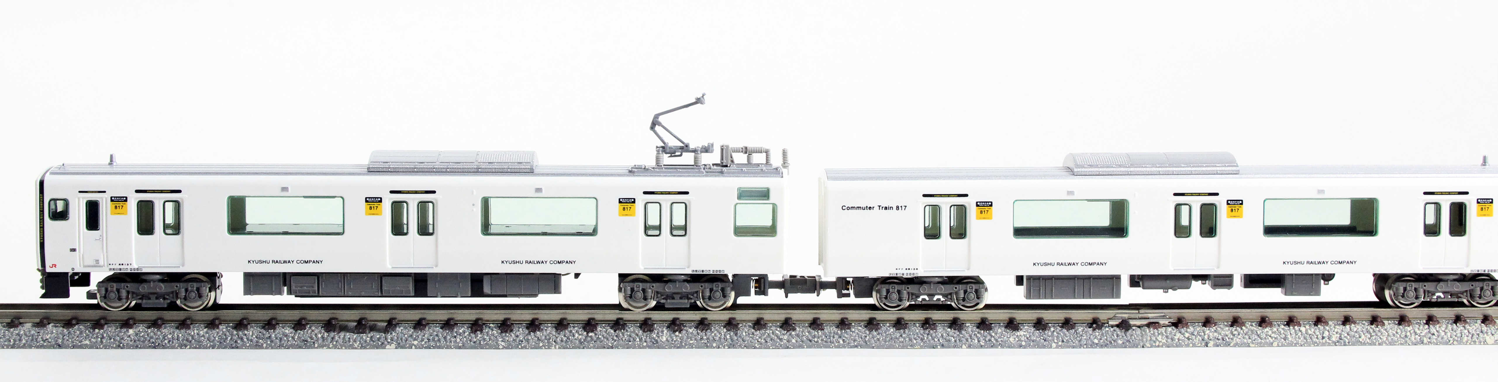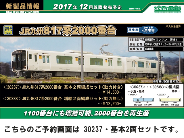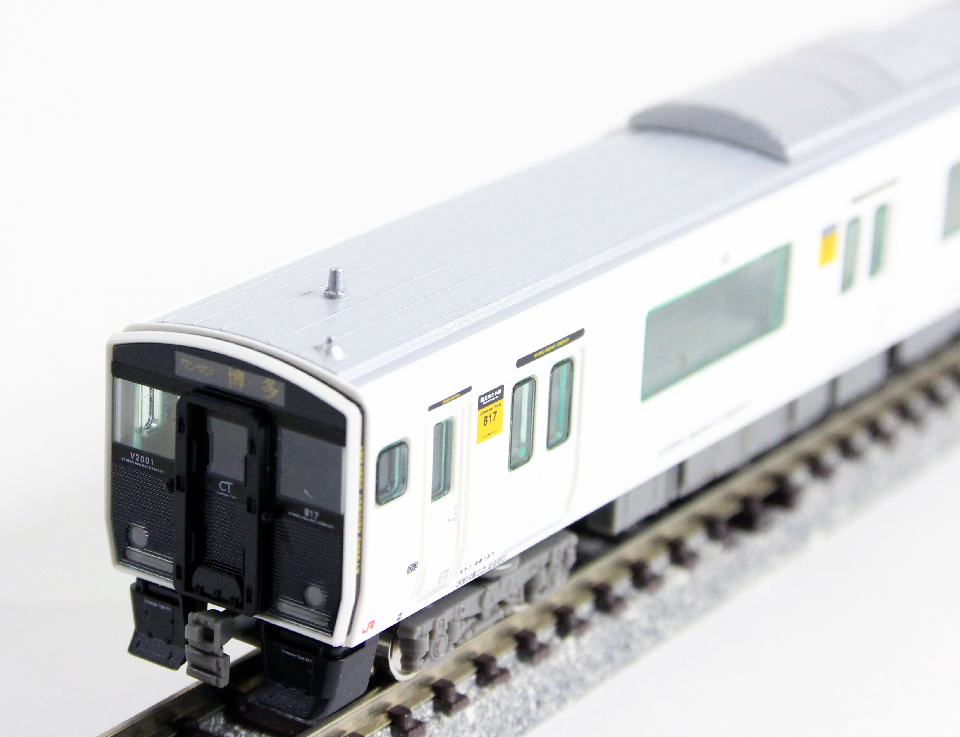 JR九州817系は、2001年に北九州地区に導入された20m3扉の近郊型車両で、その後使用線区にあわせたバリエーション展開により九州全域で活躍しています。0番台・1000番台・1100番台はアルミヘアライン仕様の転換クロスシート車、2000番台・3000番台はアルミ車体に白色塗装を施したロングシート車です。2〜3両で1ユニットとして編成され、他形式(813・815系等)との併結や数ユニットの併結による長編成での運用も可能な車両で、各地域都市圏の混雑緩和に貢献しています。2000番台は2012年に2両編成6本が登場しました。その後2013年に1本が増備され、計7編成で2017年7月現在も篠栗線(福北ゆたか線)を中心に活躍しています。