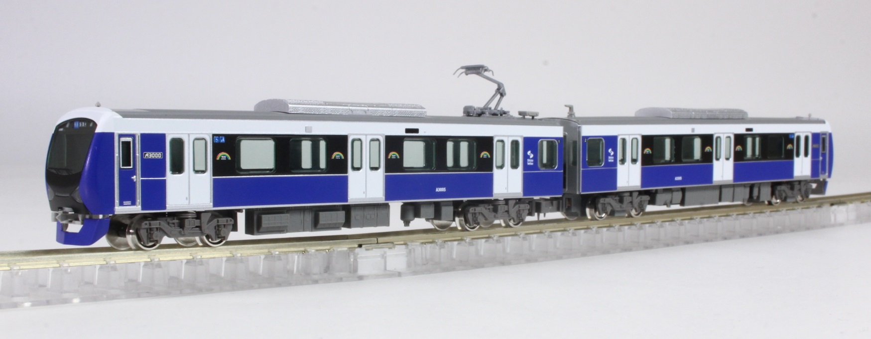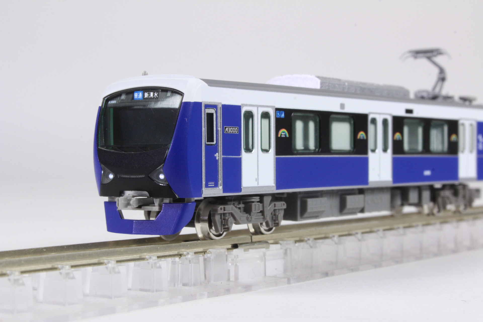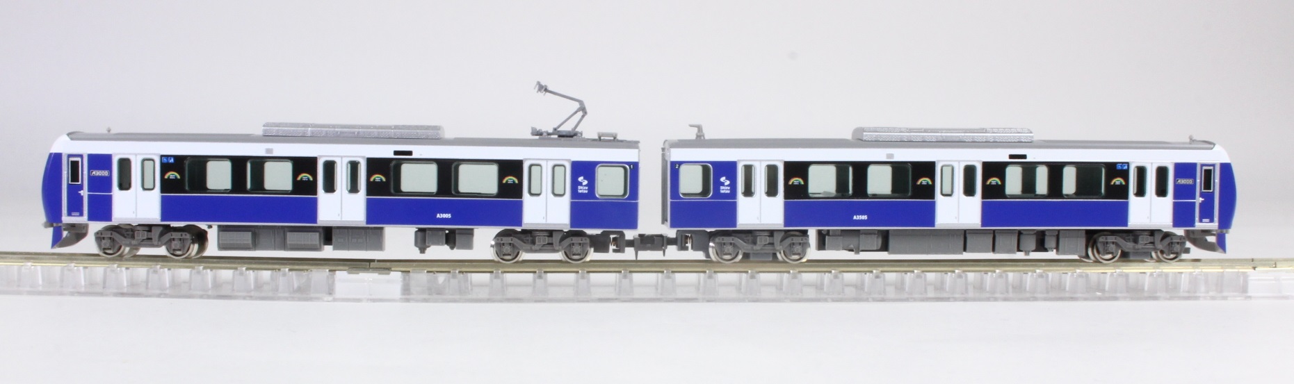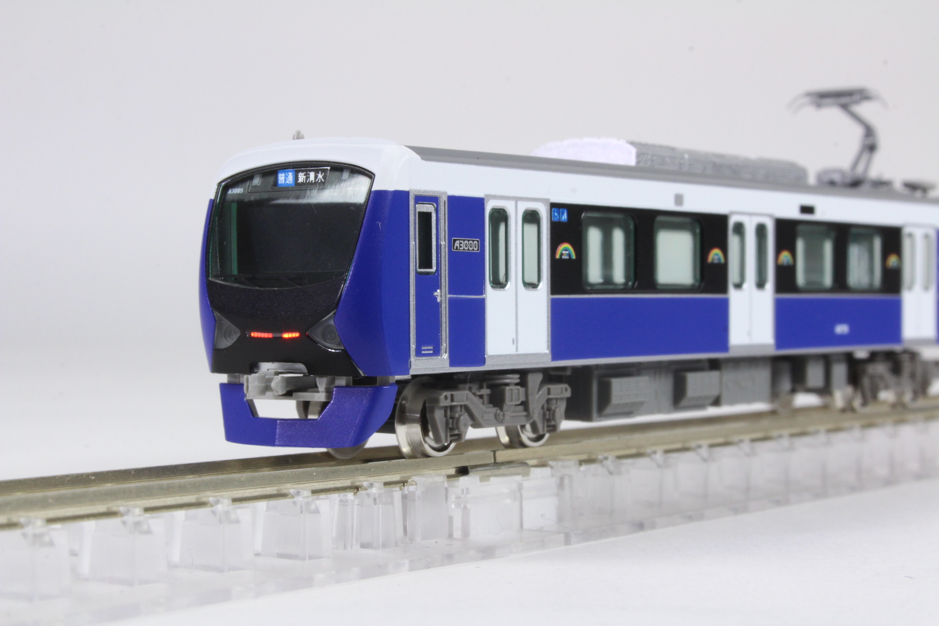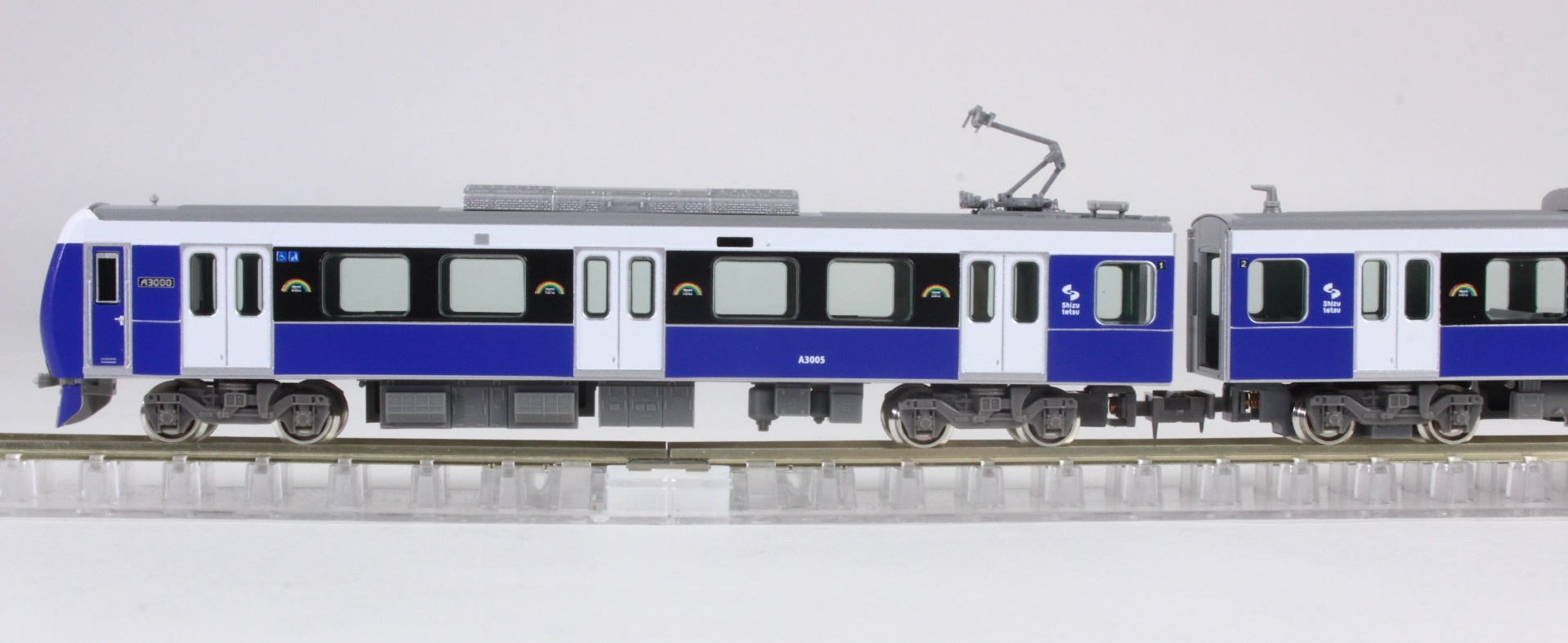 静岡鉄道A3000形は、43年ぶりの新型車両で1000形の置き換え用として2016年3月に登場し、2024年ころまでに2両編成12本を製造する予定になっています。静岡鉄道の創立100周年をむかえる2019年度までに静岡市にちなんだ7色(パッションレッド・プリティピンク・ブリリアントオレンジイエロー・フレッシュグリーン・ナチュラルグリーン・クリアブルー・エレガントブルー)が、「shizuoka rainbow train」として揃います。既にクリアブルー・パッションレッド・ナチュラルグリーン・ブリリアントオレンジイエローの4編成が活躍しており、本年3月には新たにエレガントブルー色が登場します。