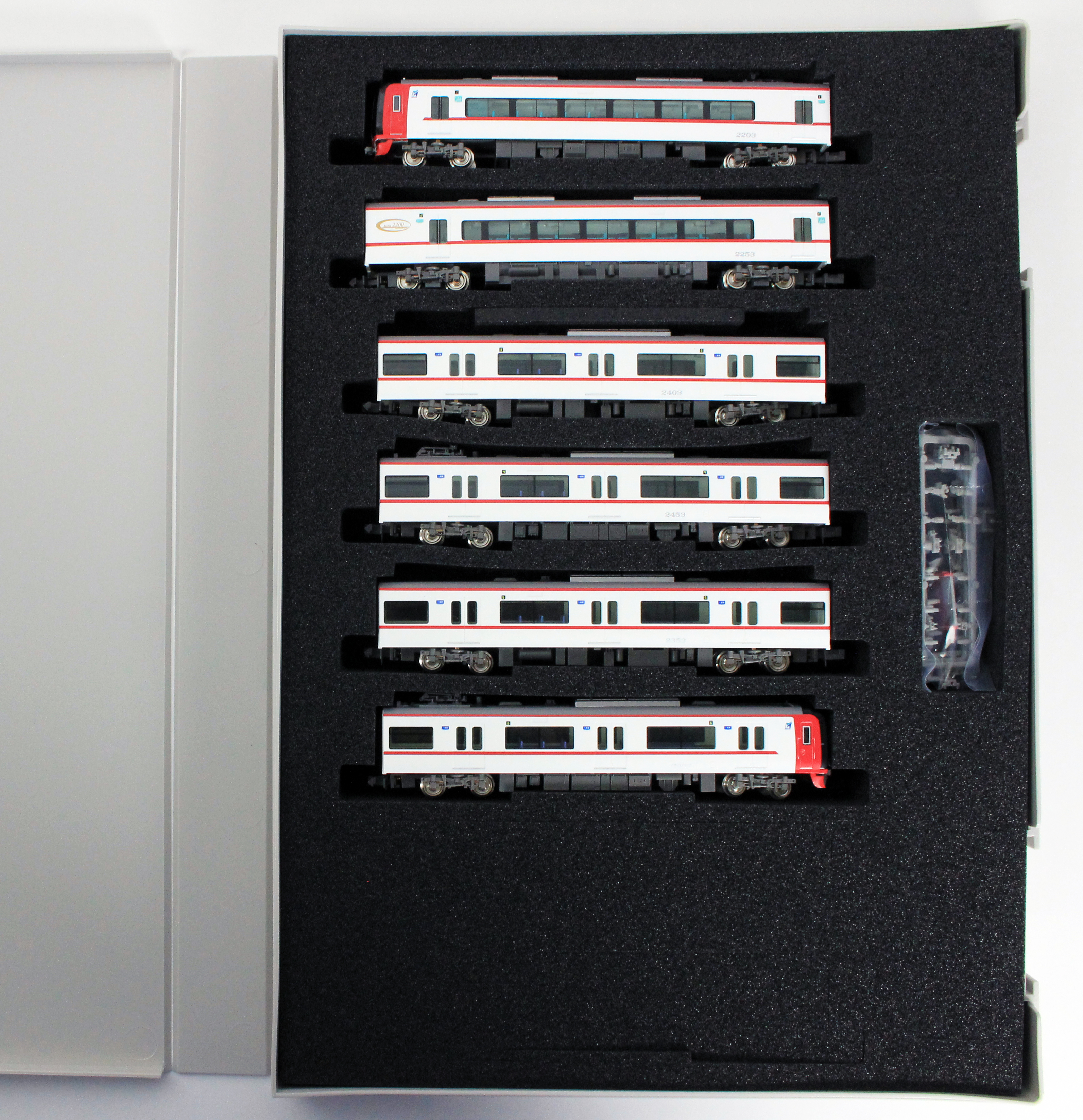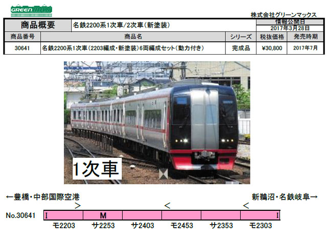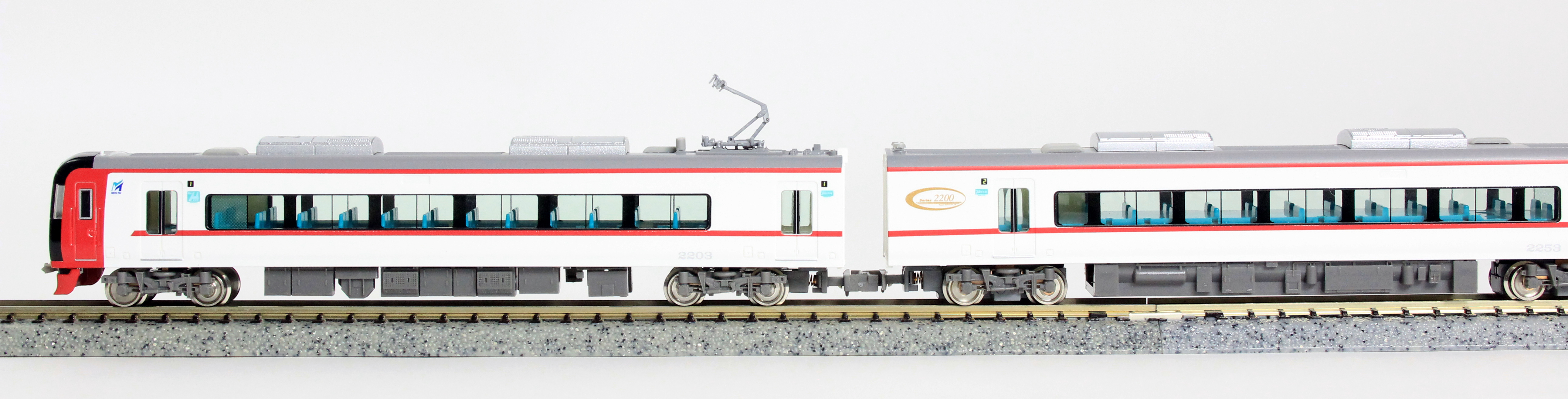 2200系は2004年に中部国際空港への鉄道アクセス用として全車特別車の2000系ミュースカイと共に登場しました。2200系は特別車2両と一般車4両の6両編成で組成されており、車内設備は2000系と3300系と共通のものとなっています。カラーリングは白色の車体に青いカラーリングの2000系とは異なり、白色の車体に名鉄カラーのスカーレットを先頭部と肩部ラインで配色しています。空港アクセスの主役として2000系と共に活躍中です。 製品は、塗装変更が行われた1次車の2203編成と2次車の2208編成を製品化します。