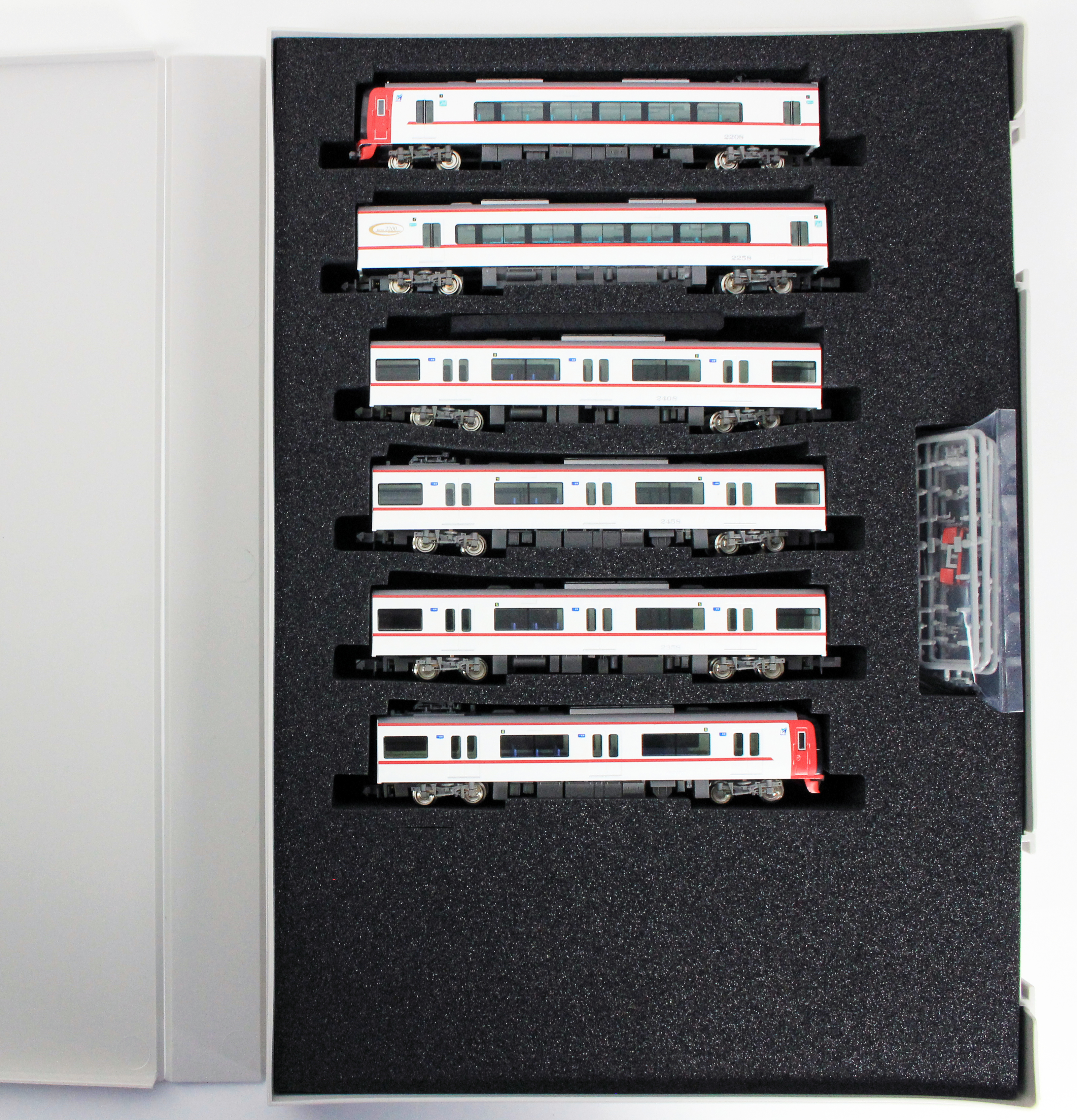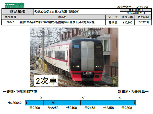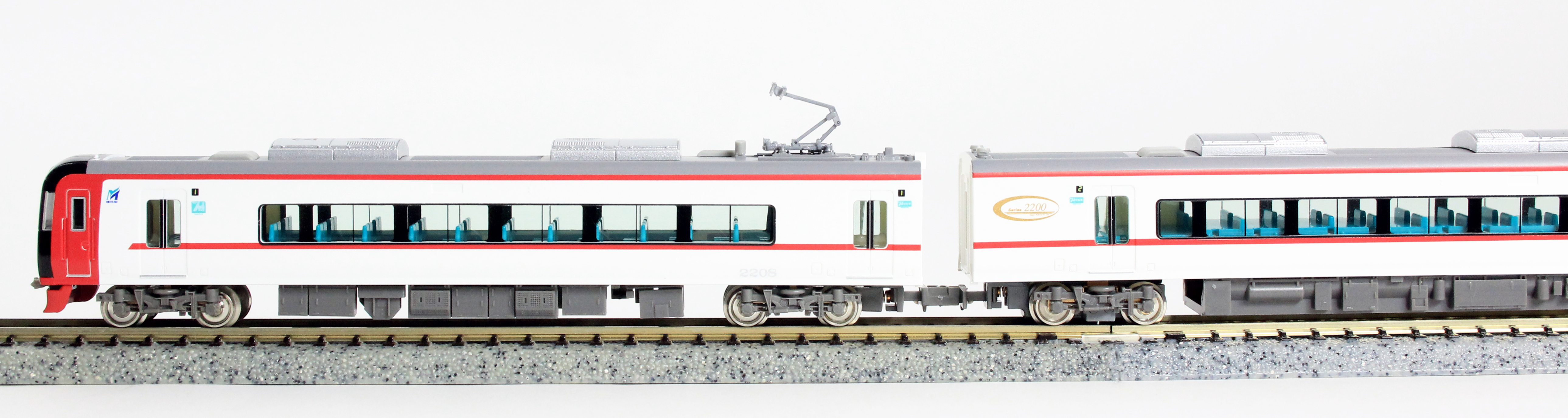 2200系は2004年に中部国際空港への鉄道アクセス用として全車特別車の2000系ミュースカイと共に登場しました。2200系は特別車2両と一般車4両の6両編成で組成されており、車内設備は2000系と3300系と共通のものとなっています。カラーリングは白色の車体に青いカラーリングの2000系とは異なり、白色の車体に名鉄カラーのスカーレットを先頭部と肩部ラインで配色しています。空港アクセスの主役として2000系と共に活躍中です。 製品は、塗装変更が行われた1次車の2203編成と2次車の2208編成を製品化します。