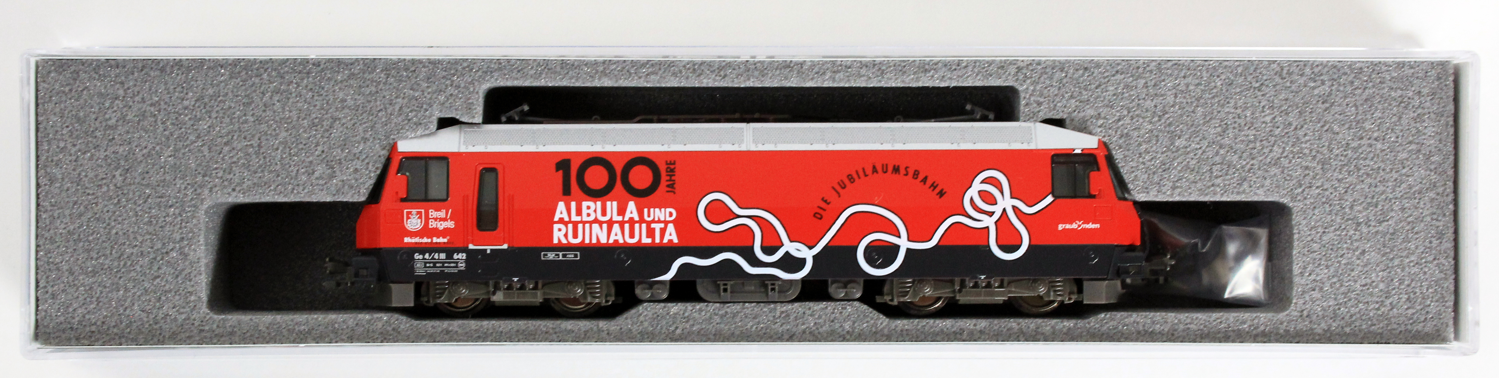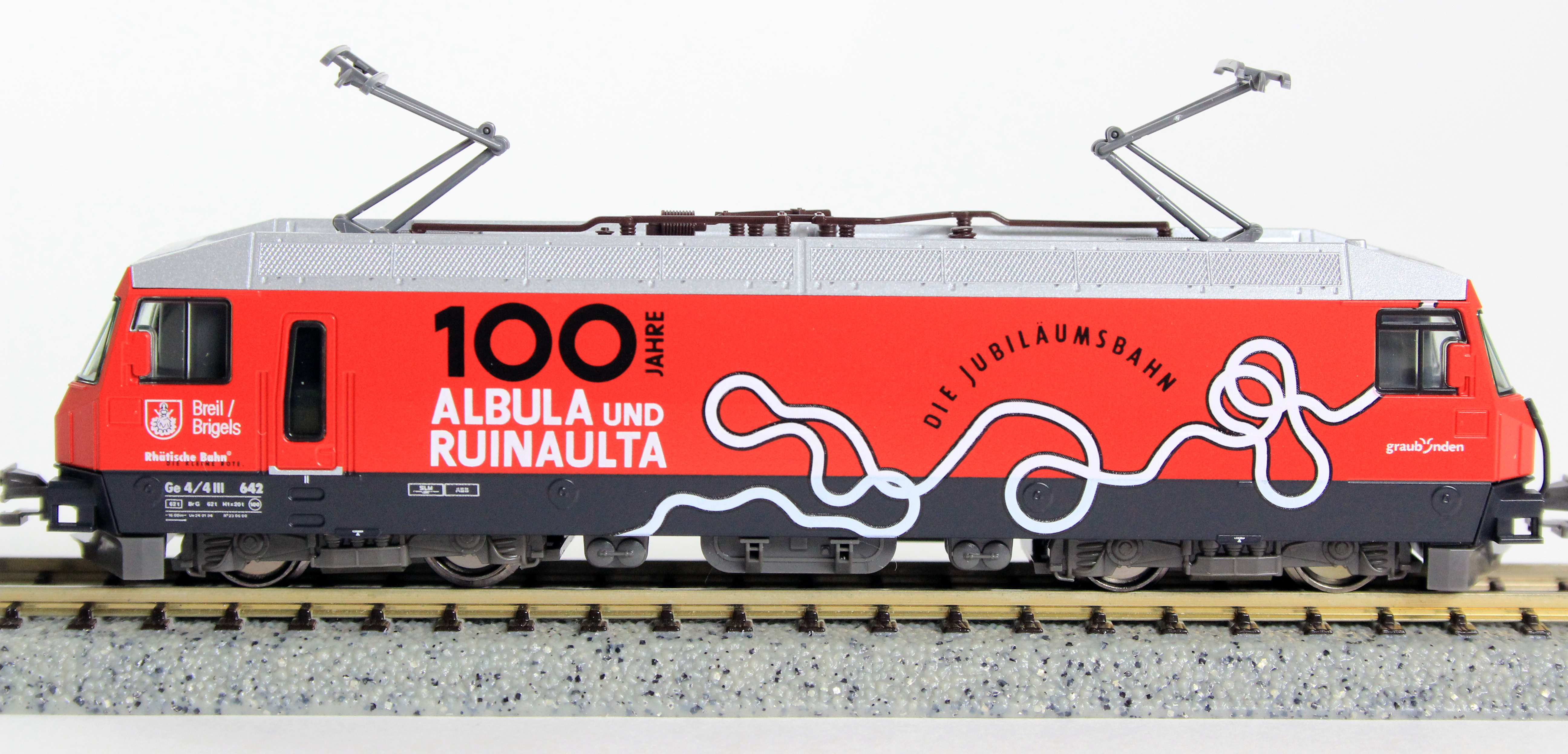 2003年にレーティッシュ鉄道アルブラ線100周年を記念して、アルブラ線の特徴であるオメガカーブとループが連続する路線の形状が描かれた塗装が642号機に施されました。