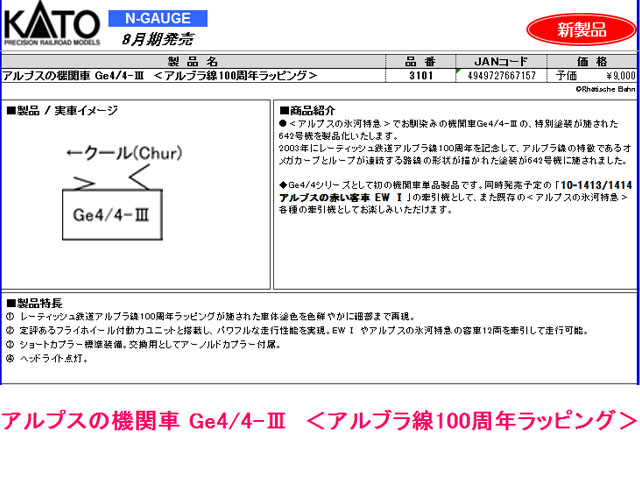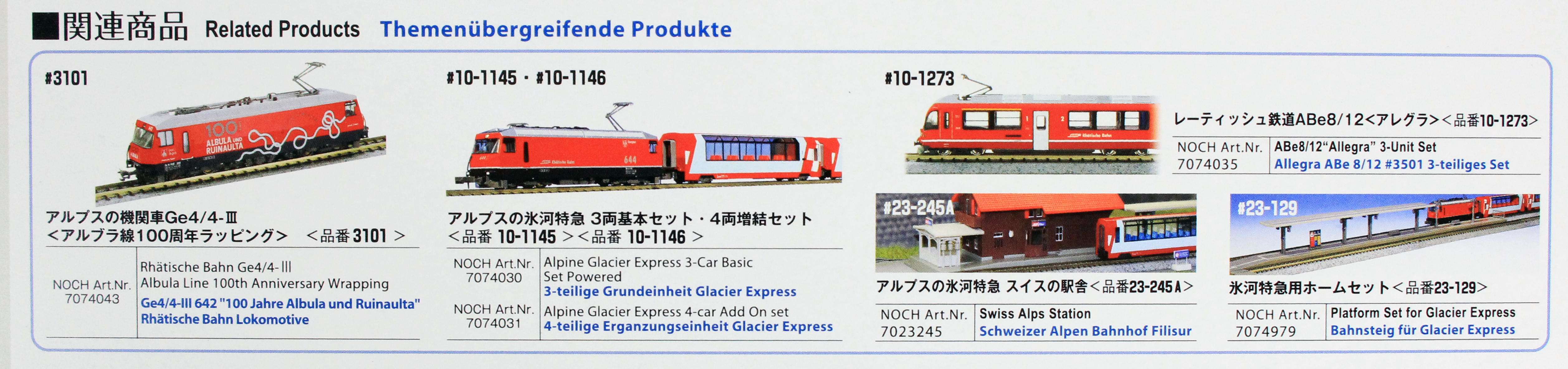 Ge4/4シリーズとして初の機関車単品製品です。同時発売予定の 「10-1413/1414 アルプスの赤い客車 EW ? 」の牽引機として、また既存の<アルプスの氷河特急>各種の牽引機としてお楽しみいただけます。