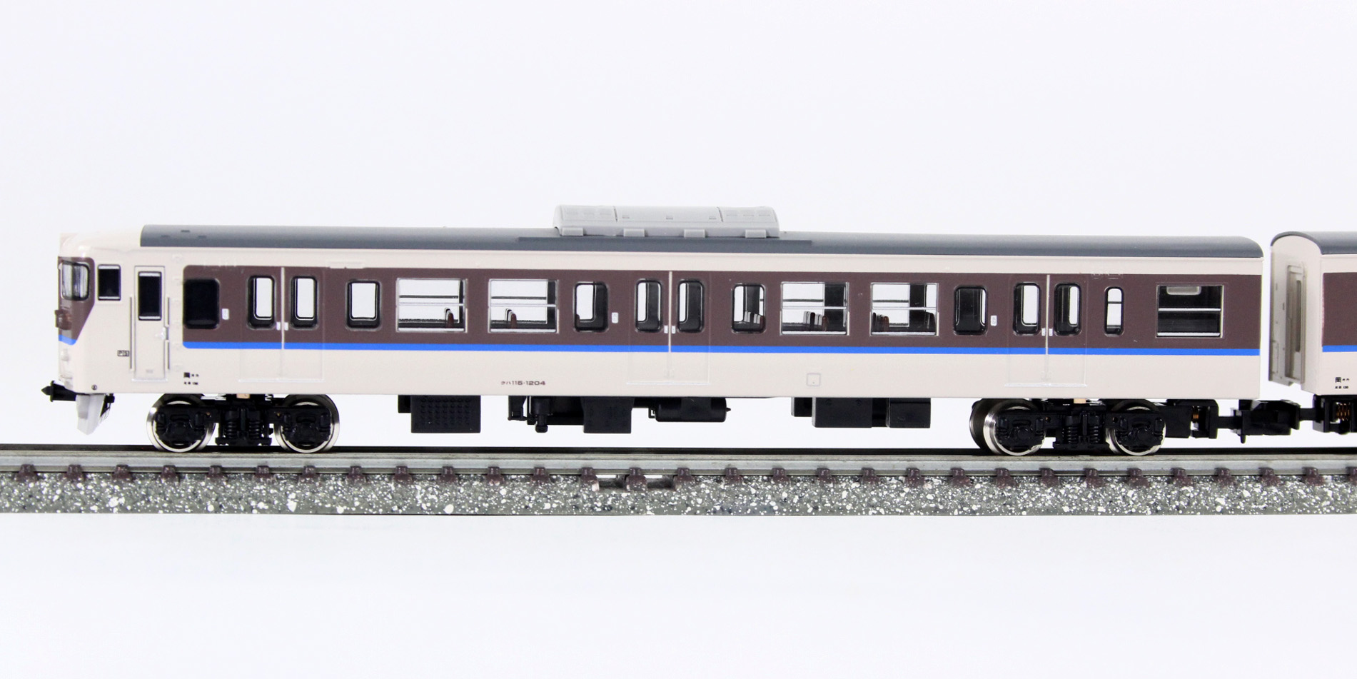 JR115系は、国鉄時代の1963年から1983年までにおよそ1900両が製造された勾配路線用の近郊形車両です。1000番台は特に耐寒・耐雪強化構造を備え、クロスシートの間隔を拡大した「シートピッチ改善車」で、そのため側面の窓割が従来車と異なる他、電動車(クモハ・モハ)の車端部に雪切室冷却風取入ルーバーが設置されている等の特徴があります。国鉄の分割民営化に伴いJR西日本に継承されたグループは、その後車体更新工事が行なわれ、「30N体質改善車」、「40N体質改善車」として現在も活躍しています。