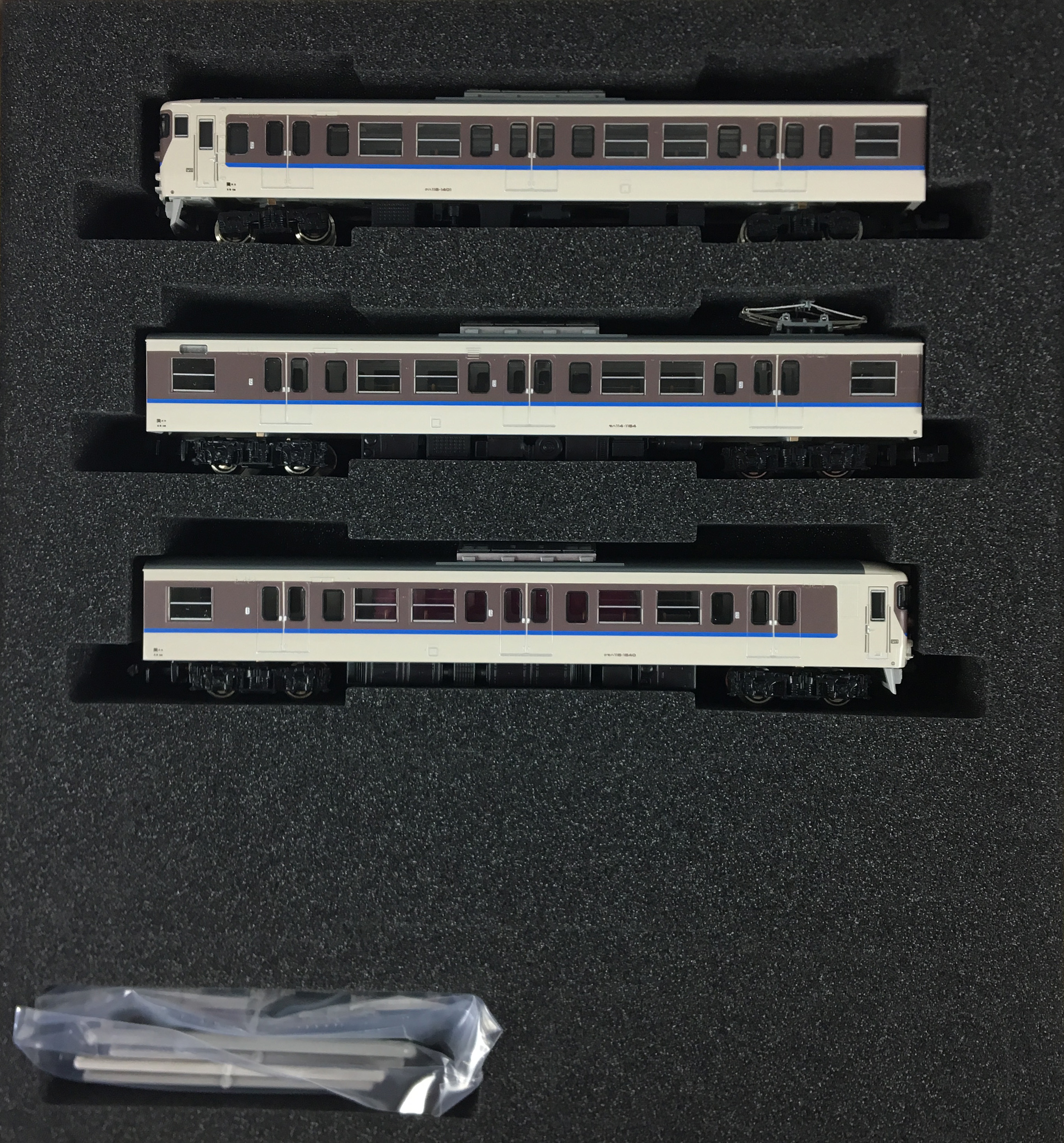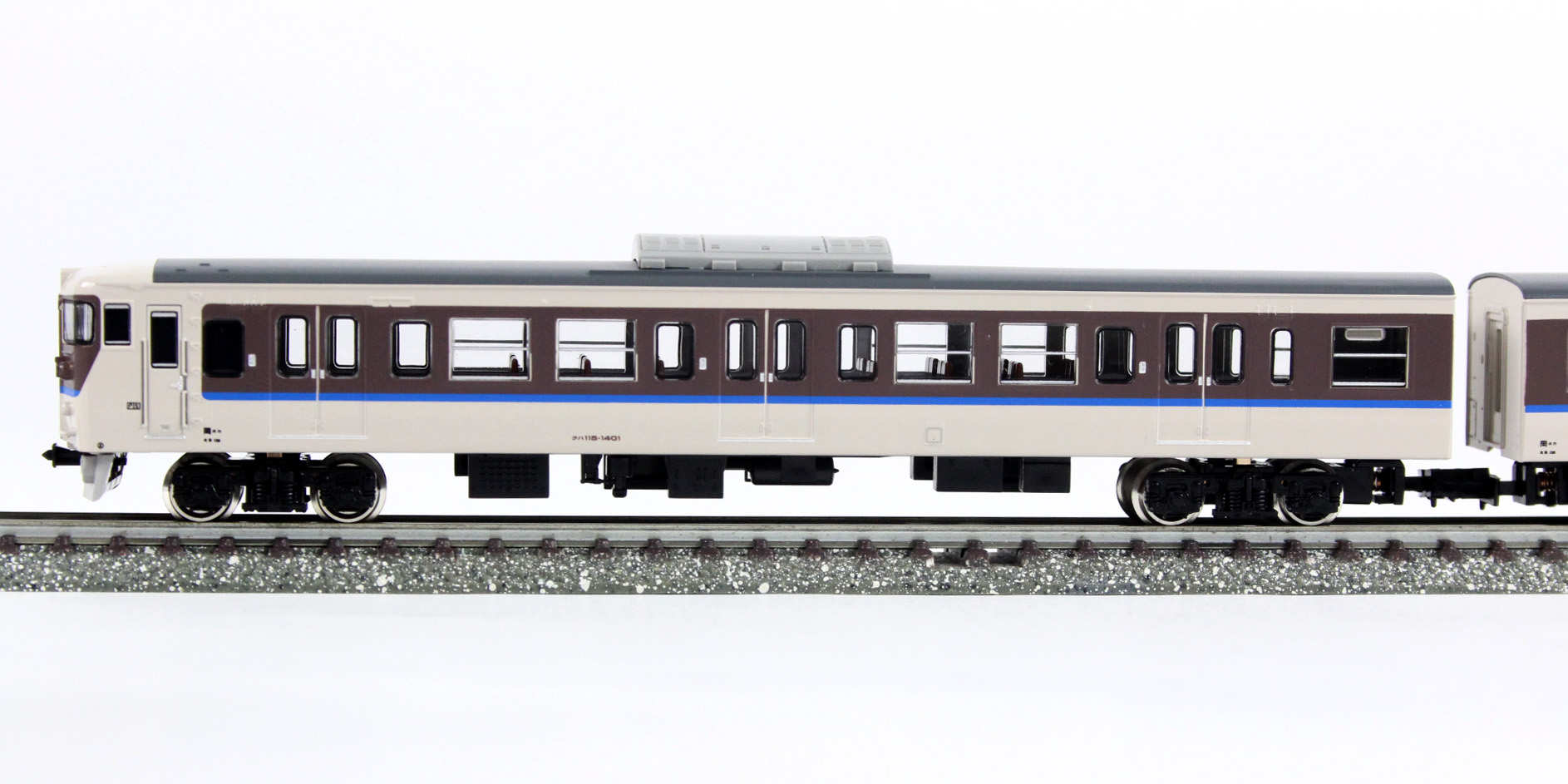 JR115系は、国鉄時代の1963年から1983年までにおよそ1900両が製造された勾配路線用の近郊形車両です。1000番台は特に耐寒・耐雪強化構造を備え、クロスシートの間隔を拡大した「シートピッチ改善車」で、そのため側面の窓割が従来車と異なる他、電動車(クモハ・モハ)の車端部に雪切室冷却風取入ルーバーが設置されている等の特徴があります。国鉄の分割民営化に伴いJR西日本に継承されたグループは、その後車体更新工事が行なわれ、「30N体質改善車」、「40N体質改善車」として現在も活躍しています。