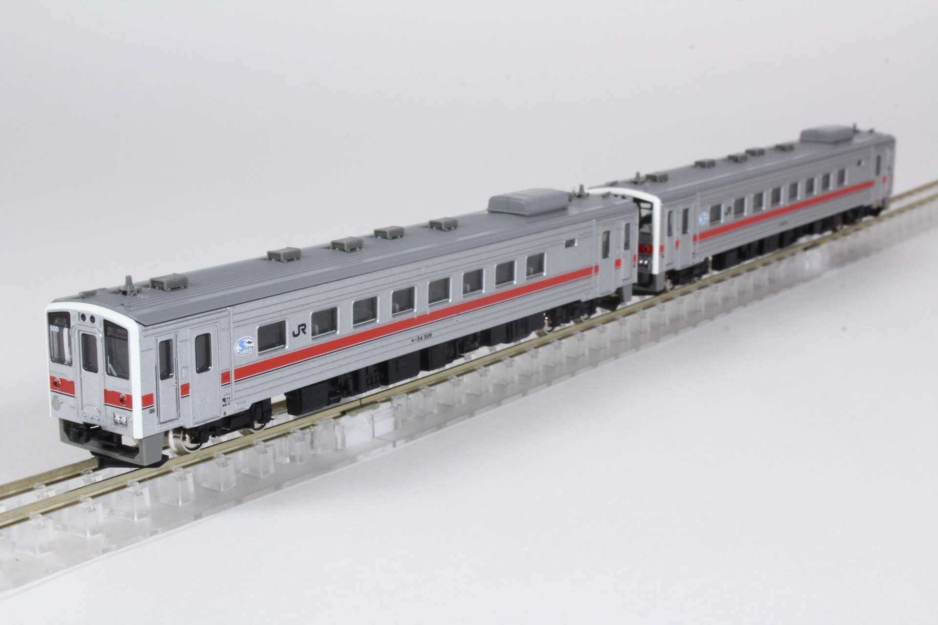 JR北海道で活躍するキハ54形は酷寒地向けとして登場した21m級の両運転台式一般形気動車です。2003年から2005年にかけて機器の更新工事が施工され、外観上では、台車が従来のDT22からボルスタレス台車N-DT54に交換されているのが大きな特徴です。機器更新工事の他に、鹿笛の設置で、前面のタイフォンが撤去されています。キハ54-527〜529は宗谷本線の急行運用の名残として、車体側面上部の赤帯が特徴となっています。