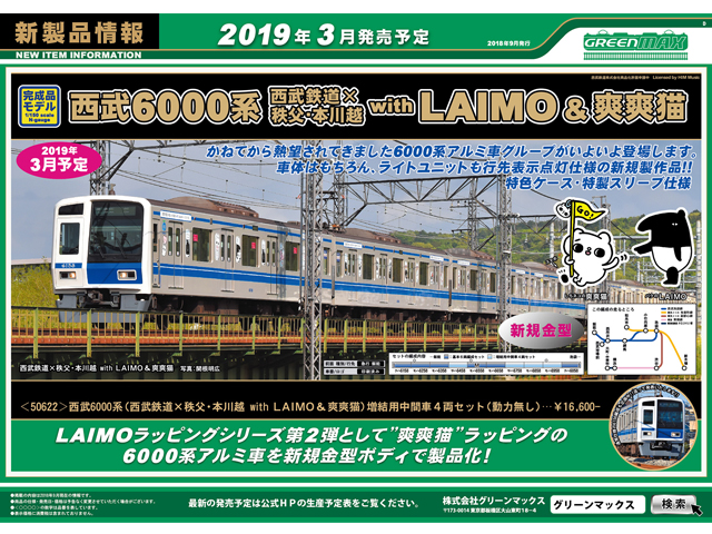 6158編成は2018年3月から訪日外国人向け企画「西武鉄道×LAIMO」ラッピング電車の第3弾として爽爽猫のイラストがラッピングされています。