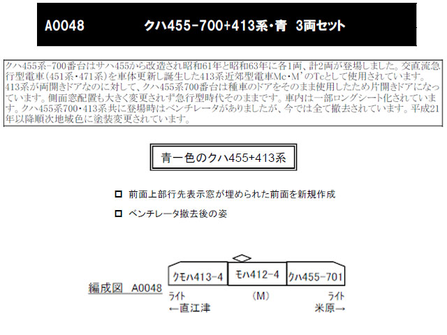 す。クハ455系700・413系共に登場時はベンチレータがありましたが、今では全て撤去されています。平成21