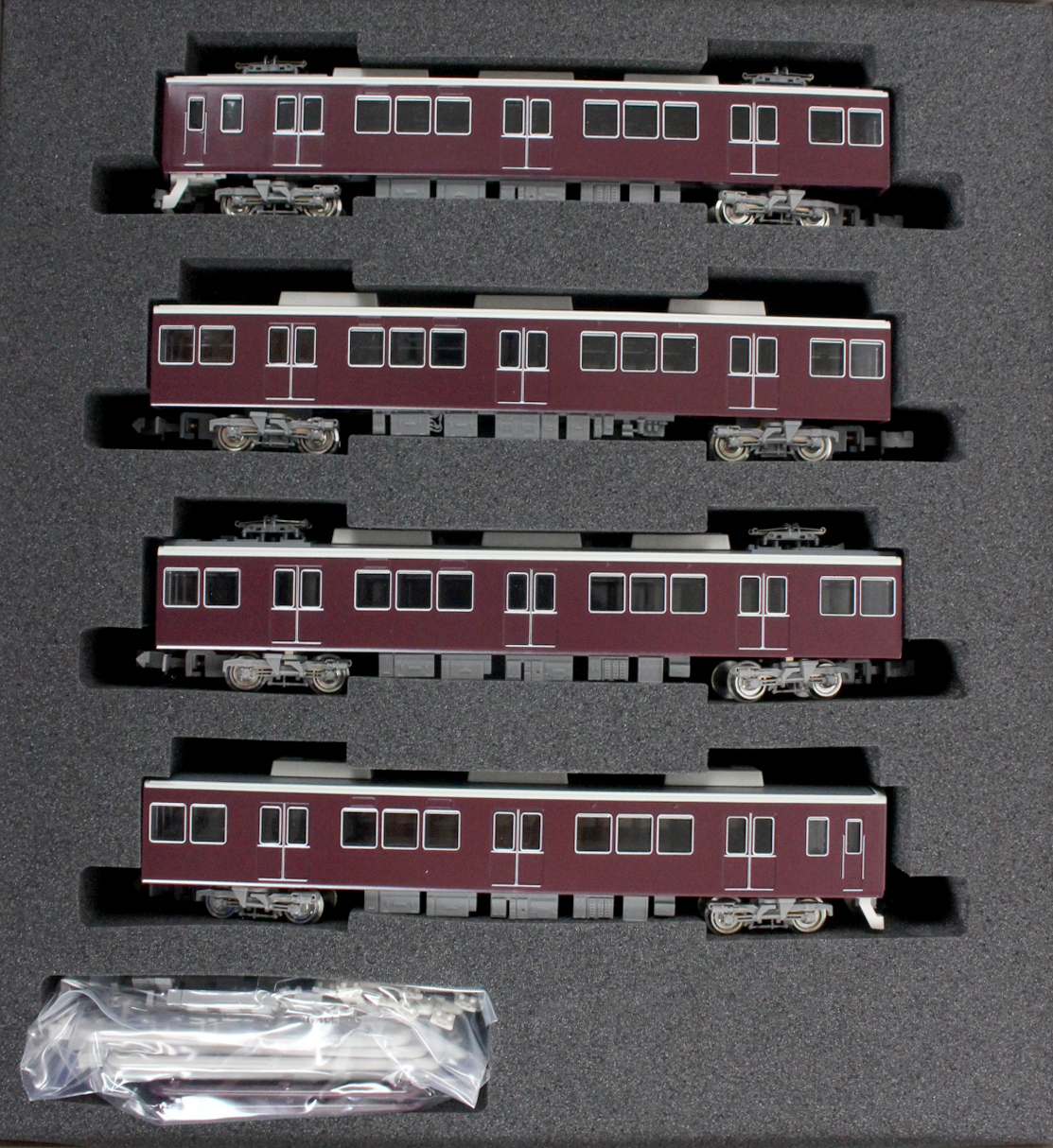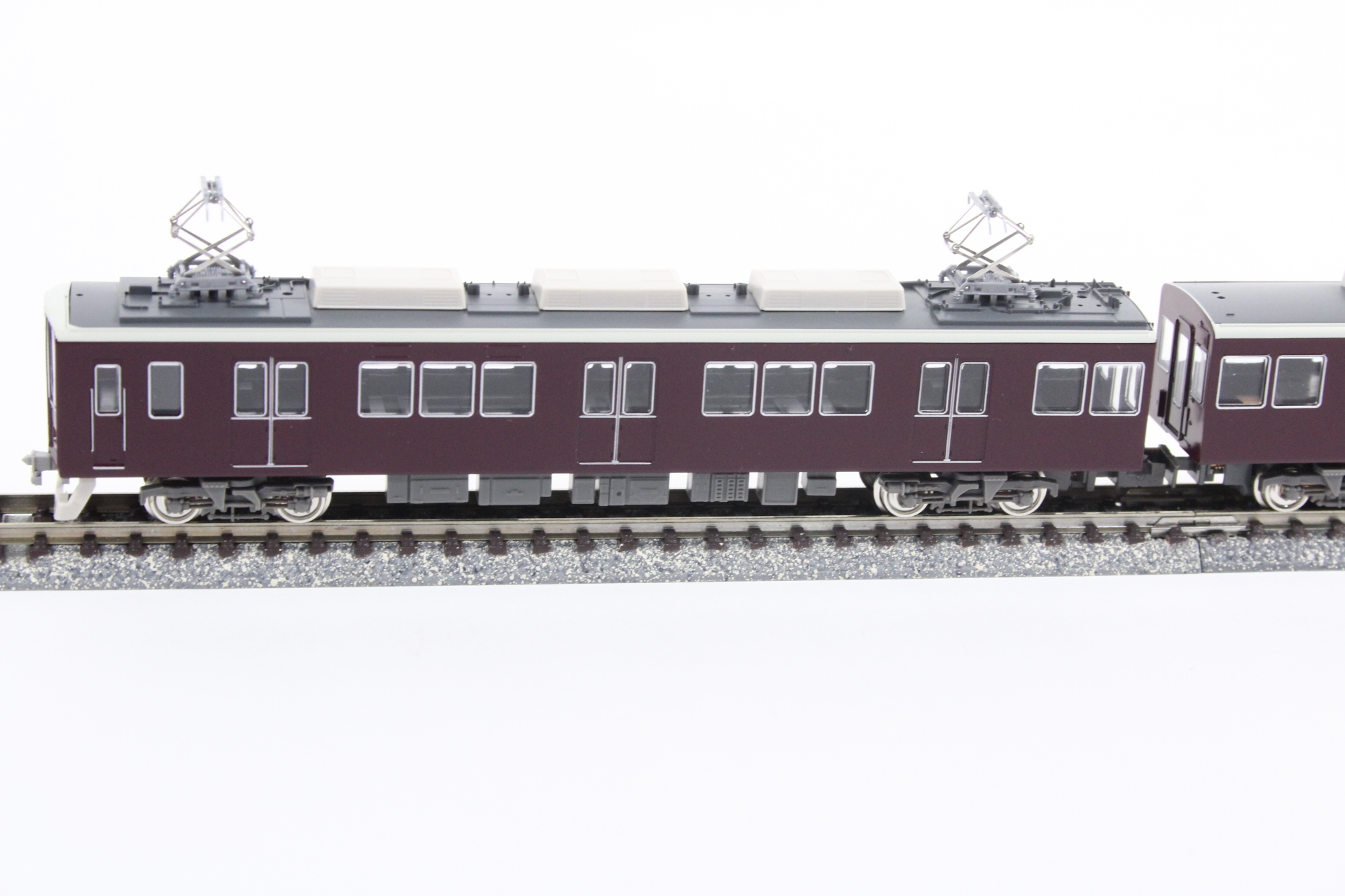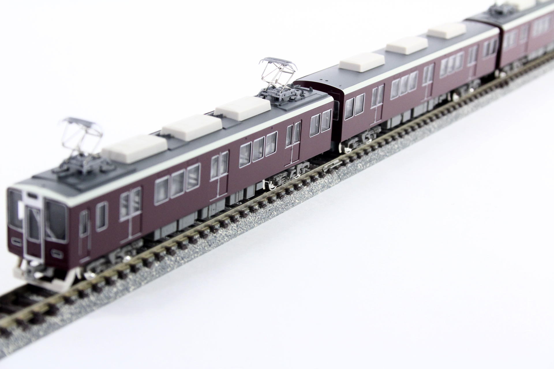 の阪急マルーンに塗装されています。前面デザインは従来の丸みを帯びたスタイ