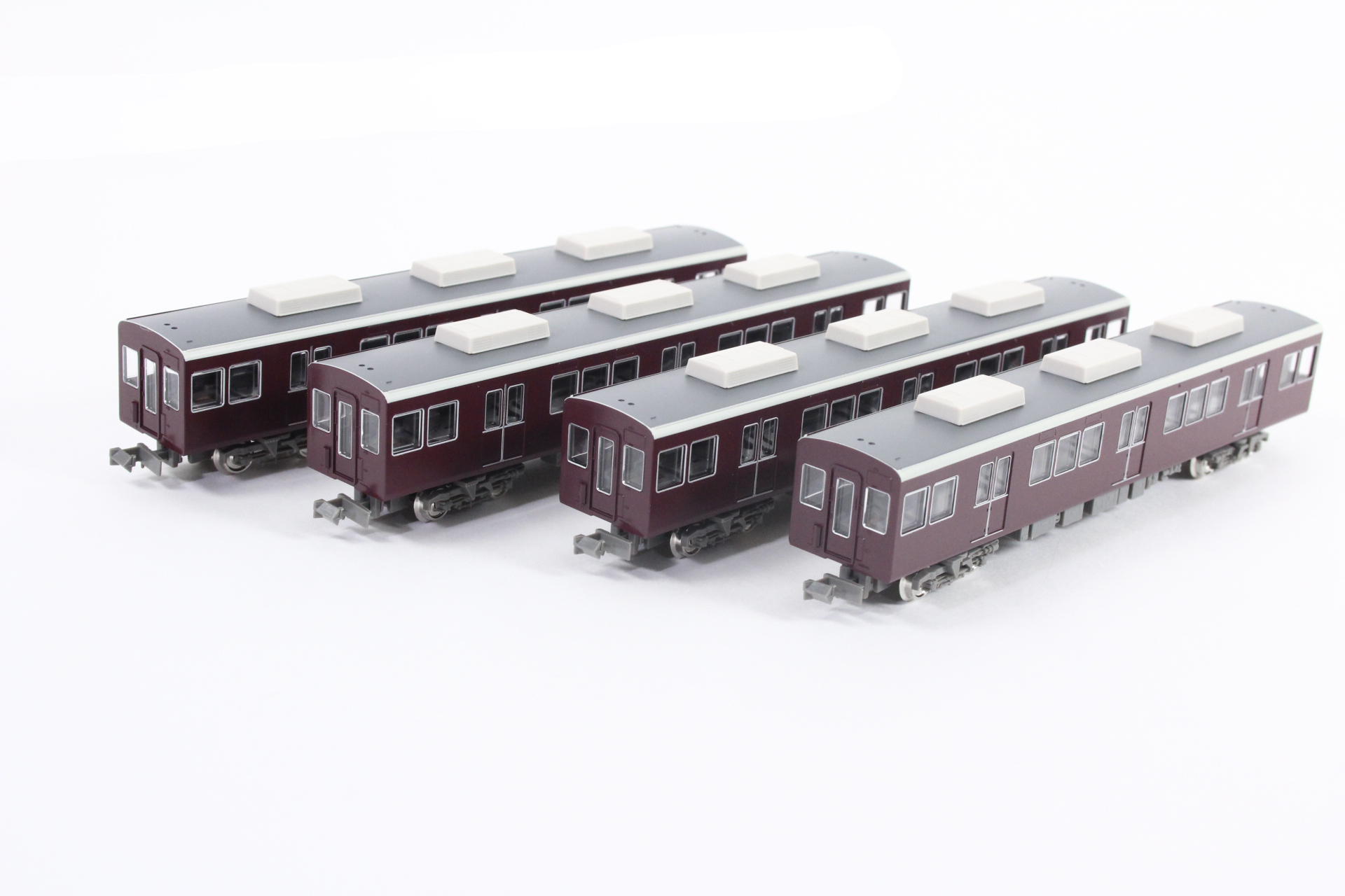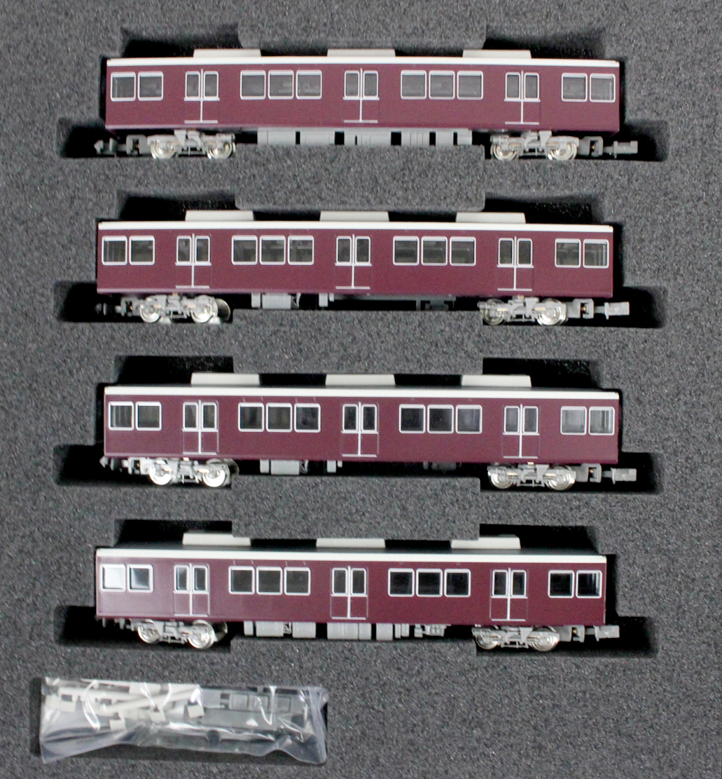 の阪急マルーンに塗装されています。前面デザインは従来の丸みを帯びたスタイ