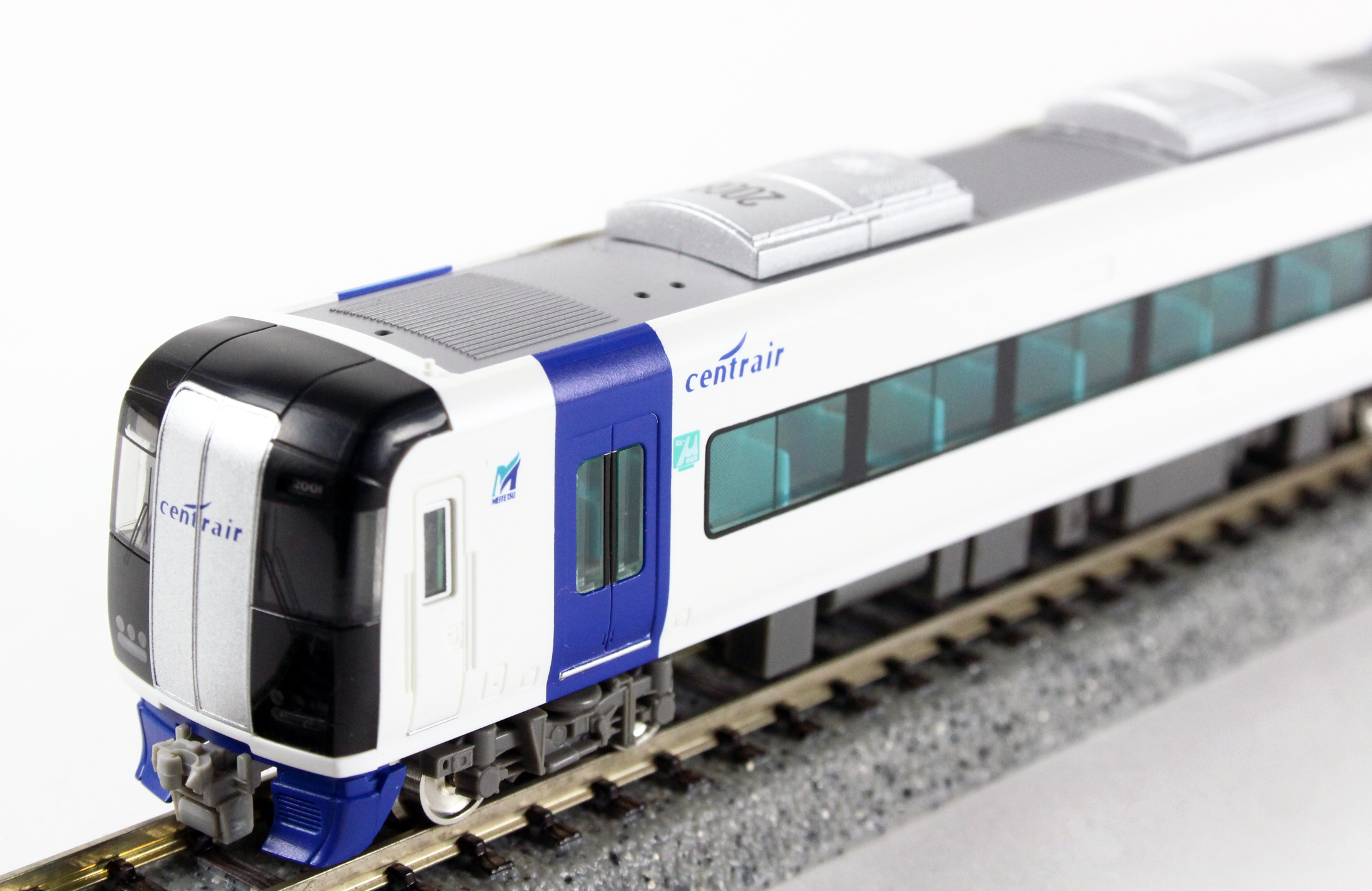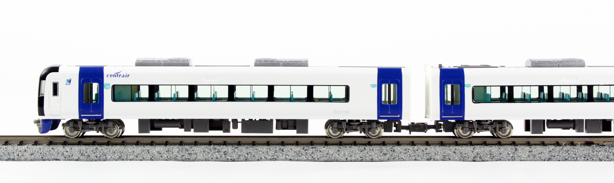 名鉄2000系は、2005年に開港した中部国際空港へのアクセス特急「ミュースカイ」用の車両で、複雑な3次曲面を持った前面や青と白の斬新なカラーデザインとともに名鉄電車の従来のイメージを一新するスタイルが特徴です。登場時は3両編成で運用されていましたが、利用者急増による混雑緩和のため、2006年に全編成の4両編成化のための中間車と、3次車となる4両編成2本の増備が行なわれました。3次車では新たに荷物置き場が設置されその部分の窓配置が従来車と異なります。後に従来車も荷物置き場が設置され、その部分の窓はカーテンが常時下ろされた状態になっています。