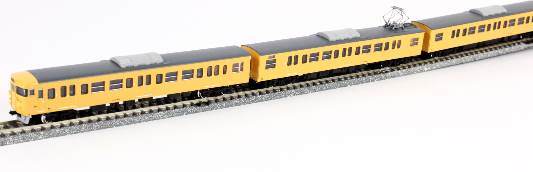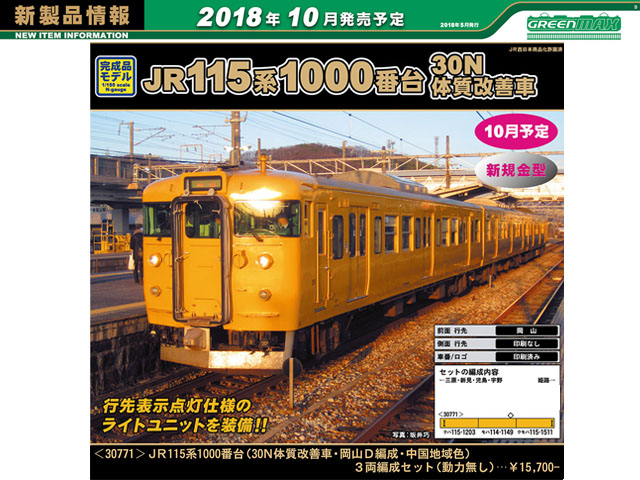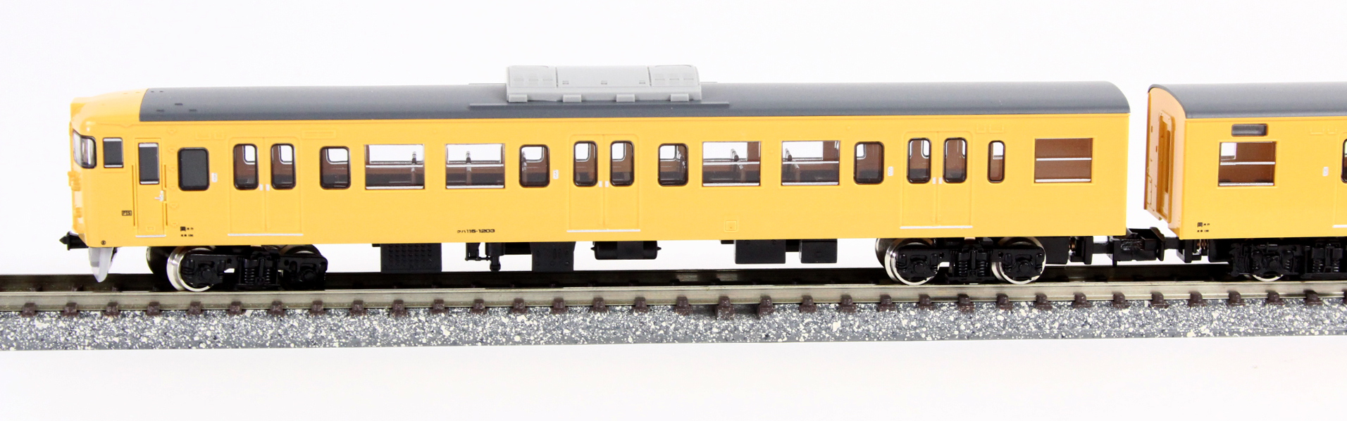 JR115系は、国鉄時代の1963年から1983年までにおよそ1900両が製造された勾配路線用の近郊形車両です。1000番台は特に耐寒・耐雪強化構造を備え、クロスシートの間隔を拡大した「シートピッチ改善車」で、そのため側面の窓割が従来車と異なる他、電動車(クモハ・モハ)の車端部に雪切室冷却風取入ルーバーが設置されている等の特徴があります。国鉄の分割民営化に伴いJR西日本に継承されたグループは、その後車体更新工事が行なわれ、「30N体質改善車」、「40N体質改善車」として現在も活躍しています。