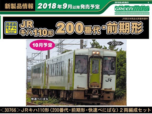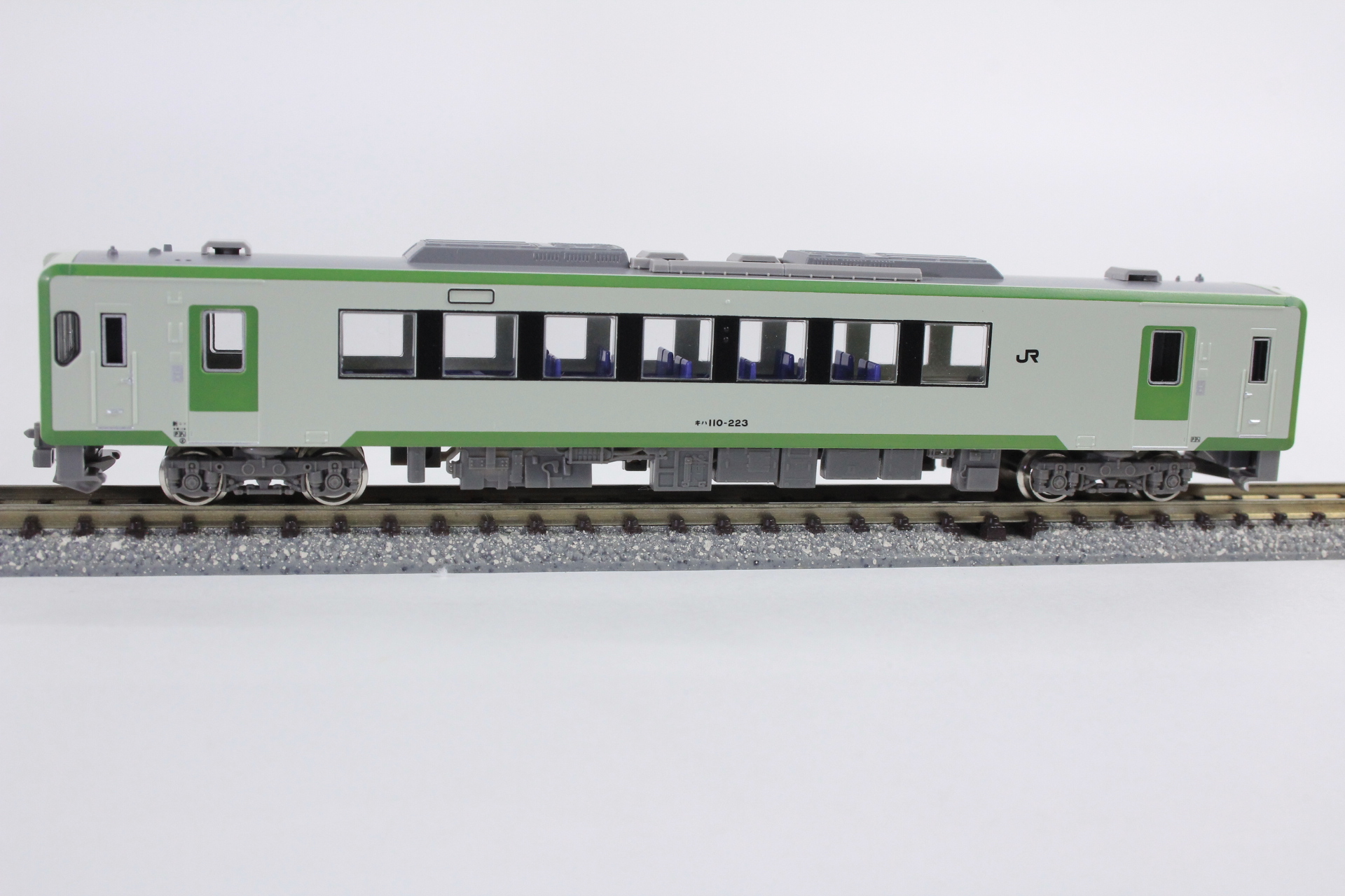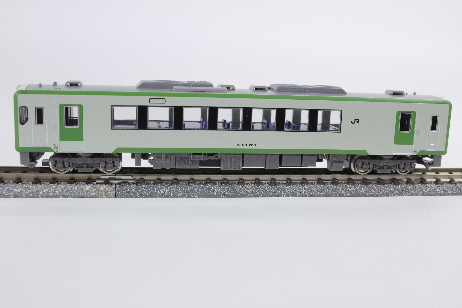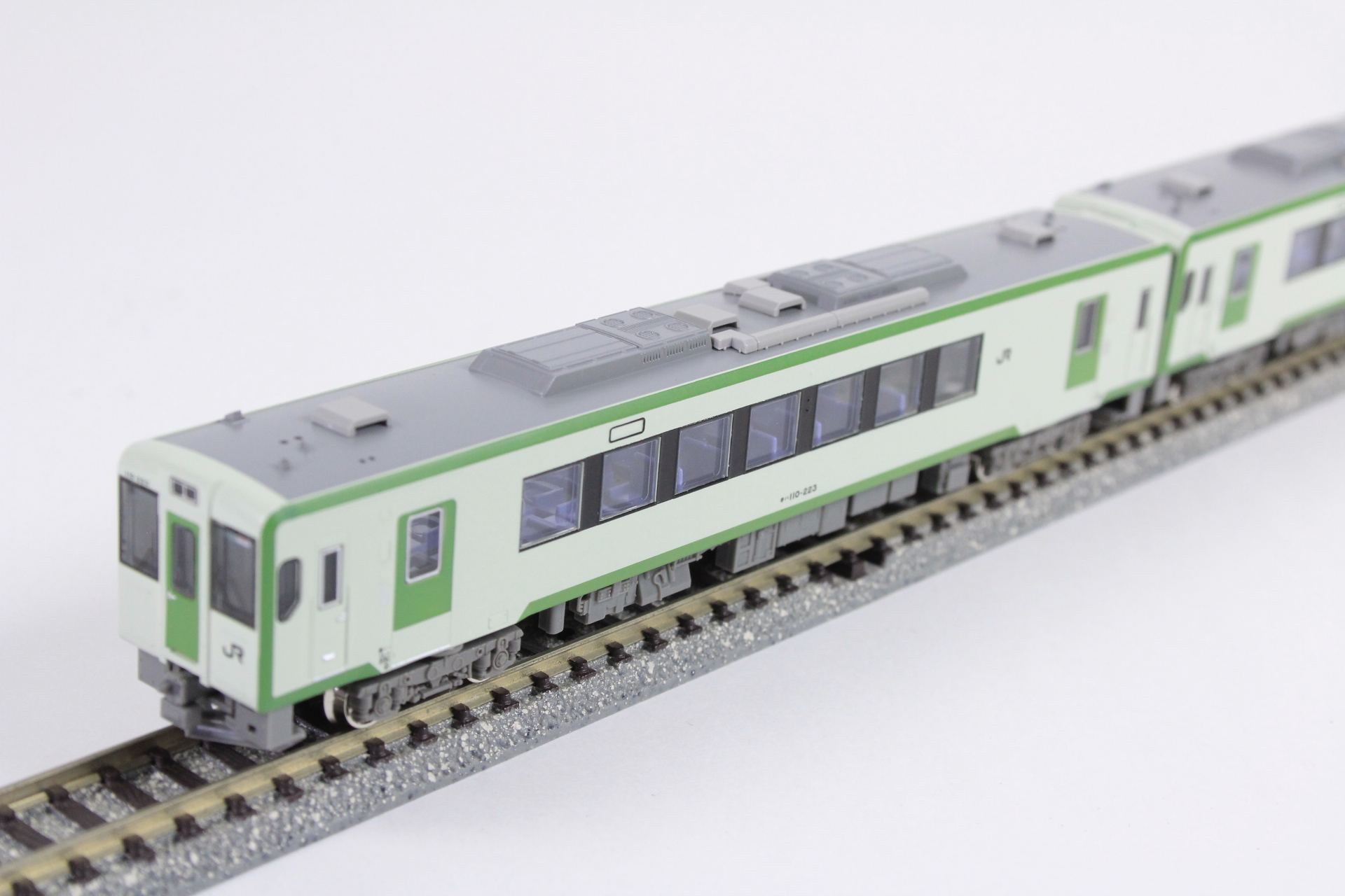 キハ100系列は、ローカル線のサービス改善を図るためJR東日本が開発した気動車で、車体の長さ、両運転台・片運転台など多彩な車両があり、路線条件に応じて各地で活躍範囲を広げています。電車並みの加速性能も持っており、ローカル線のスピードアップに大きく寄与しています。キハ110形100番代以降のグループは、普通列車用に開発されたグループで、車体長が20mになり、200番代は客扉が引戸式に変更されています。200番代の後期形は安全対策のため運転台が250?延長されています。